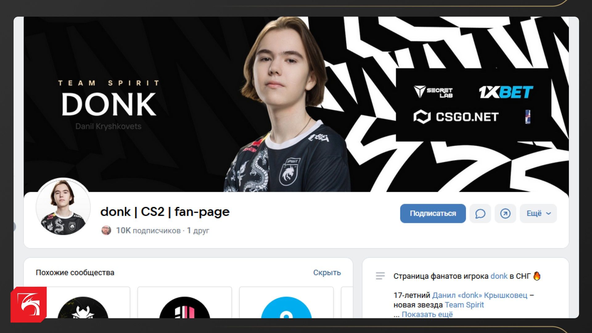 Активность в социальных сетях. Это и новости карьеры, и результаты турниров, и просто какие-то профессиональные советы или просто мемы. У некоторых стимеров/игроков/кастеров есть собственные фанатские сообщества. Например, так выглядит страница фанатов игрока Данилы donk Крышковца.