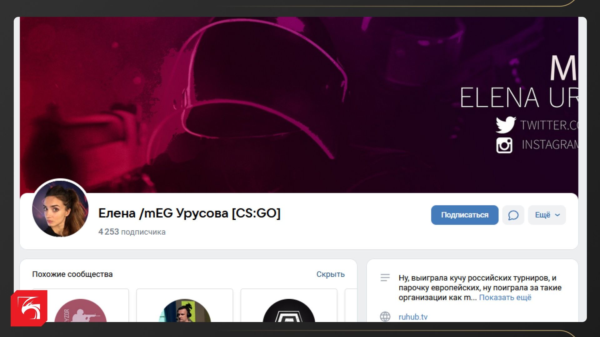 А это страница Елены mEG Урусовой — бывшей киберспортсменки, а ныне — кастера и ведущей студии аналитики ruhub CS GO.