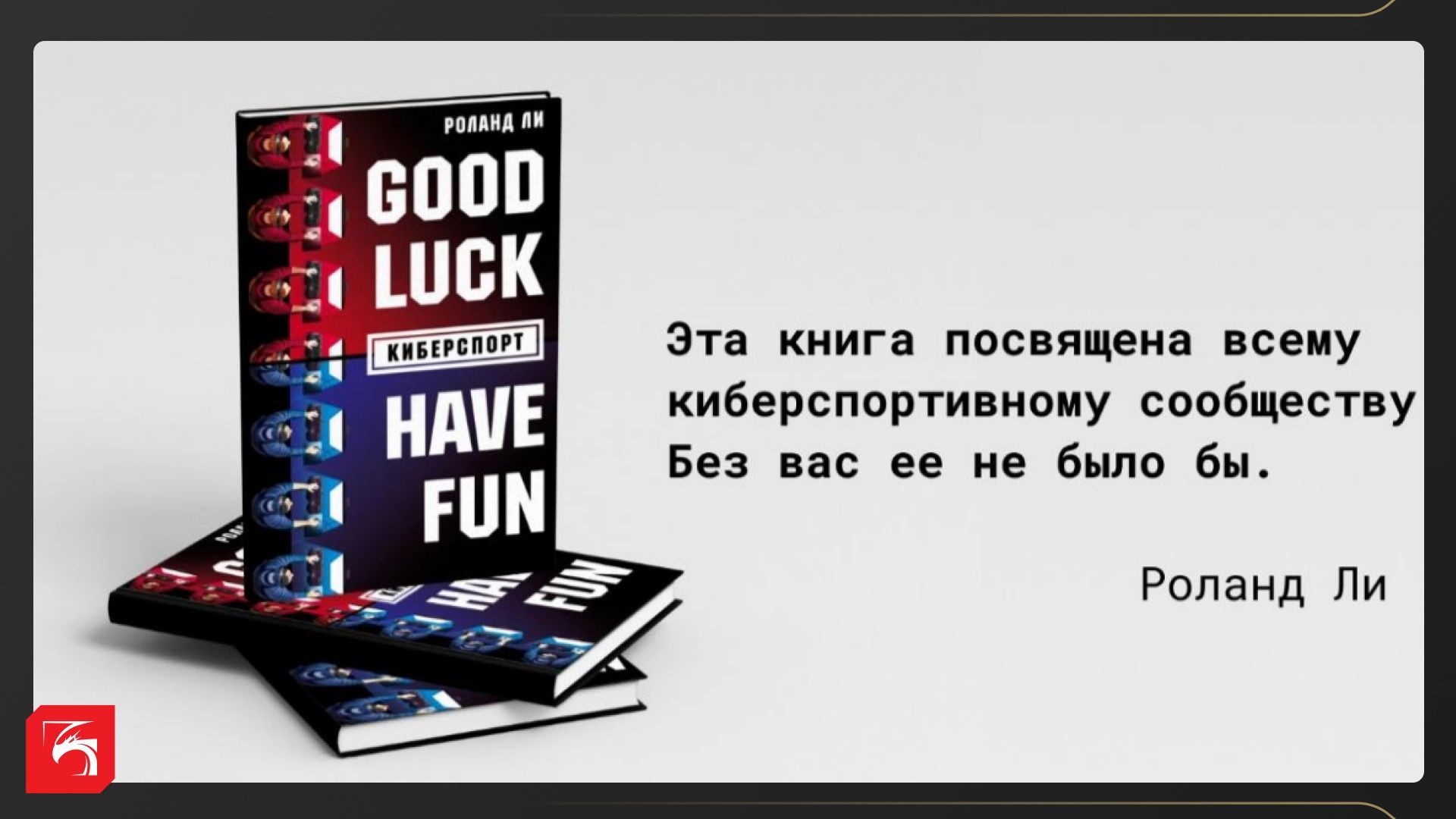 «Киберспорт обладает всеми признаками реального соревнования: большие призовые, барьер навыков, отделяющий любителей от профессионалов, сопереживание фанатов, а теперь еще и технологическая инфраструктура, способная служить основой для всего этого», — цитата из книги Роланда Ли «Киберспорт». В англоязычной версии название книги более развернуто: Good Luck Have Fun: The Rise of ESports («Удачи и веселья: расцвет киберспорта»).