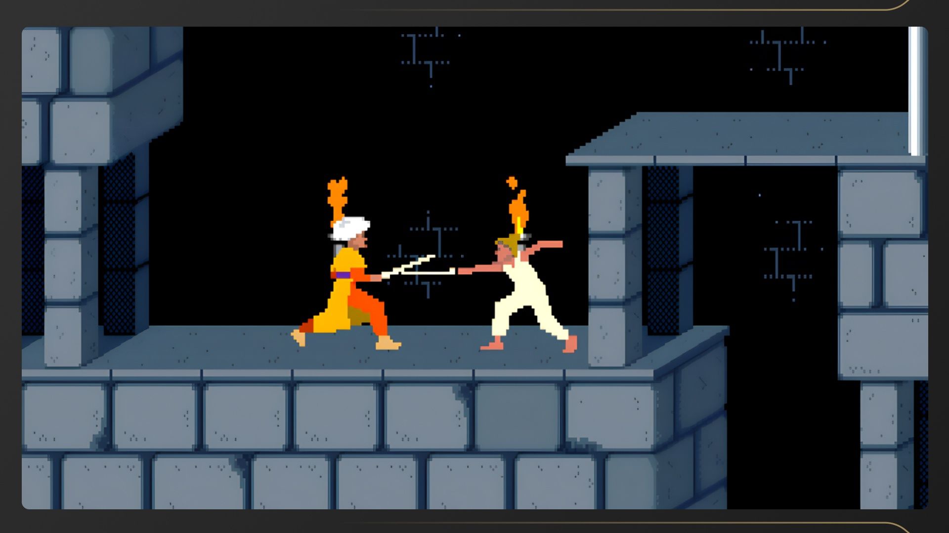 Другой важный этап эволюции фехтования в видеоиграх — релиз первой Prince of Persia (1989) от Джордана Мехнера. Хотя основное внимание в игре отведено платформингу и головоломкам, дуэли на мечах стали её отличительной чертой. Бои с охранниками требуют от игрока точной реакции и правильного выбора момента для нанесения удара или выставления блока. Это вносит в поединки тактический элемент. Однако анимации ударов были ограниченными, а сами бои — достаточно однообразными.