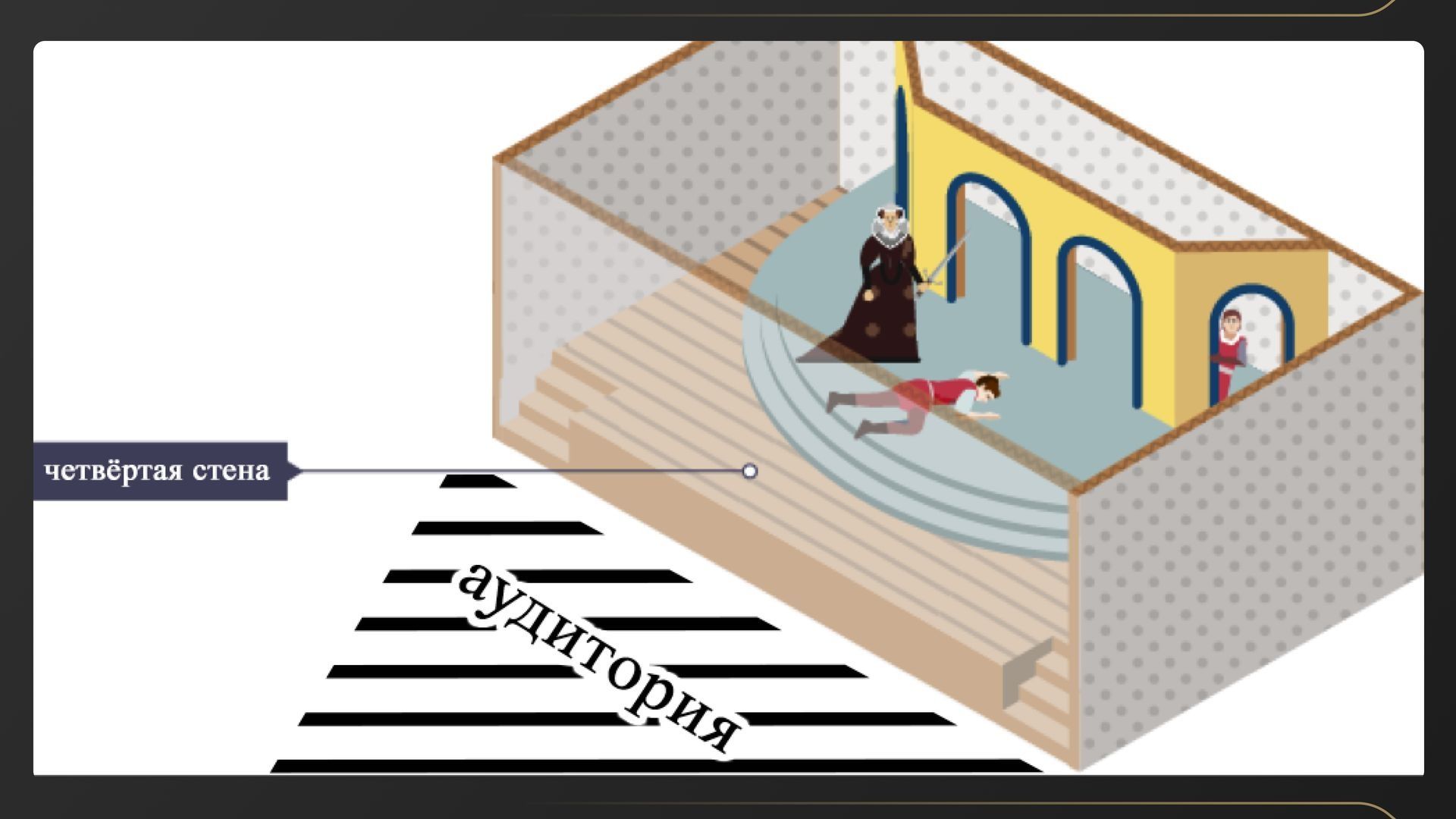 К слову, «четвёртая стена» получила своё название именно благодаря театру. На сцене есть три физические стены — боковые декорации или кулисы, а также задние фоновые декорации. Но есть ещё одна, невидимая, которая отделяет сцену от зала со зрителями. Чтобы втянуть аудиторию в события спектакля, рушится граница между вымыслом и реальностью. Так сюжет и персонажи становятся интереснее и ближе каждому присутствующему в зале.