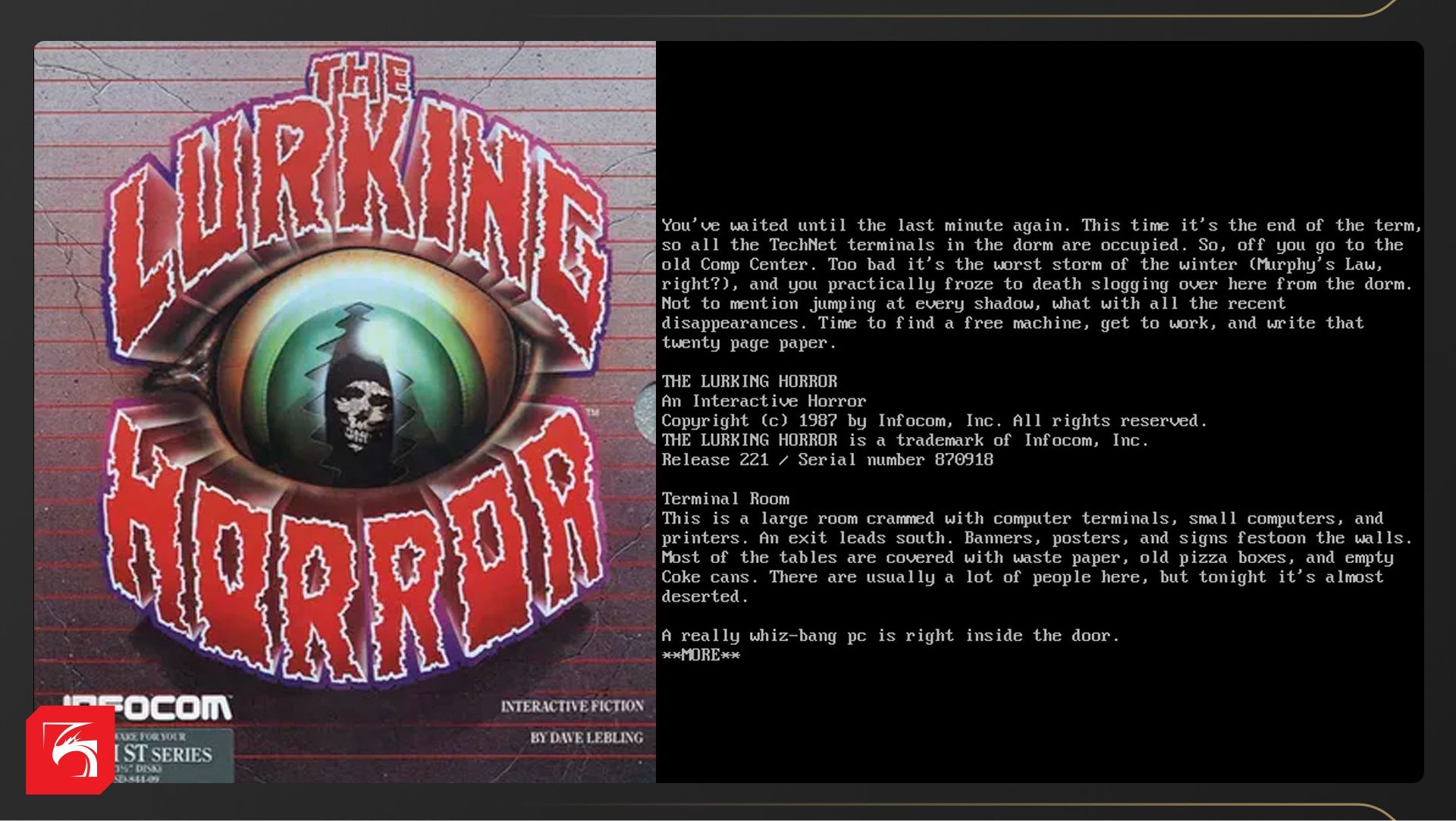The Lurking Horror (1987) — текстовый хоррор для MS-DOS и Apple II. Сюжет рассказывает о студенте, который пытается закончить курсовую работу для университета. По дороге в учебный корпус он попадает в сильную снежную бурю. И это лишь начало его злоключений. Ему предстоит сражаться с демонами и зомби, разгадать загадку таинственного самоубийства на территории кампуса и сдать уже, наконец, свою курсовую.