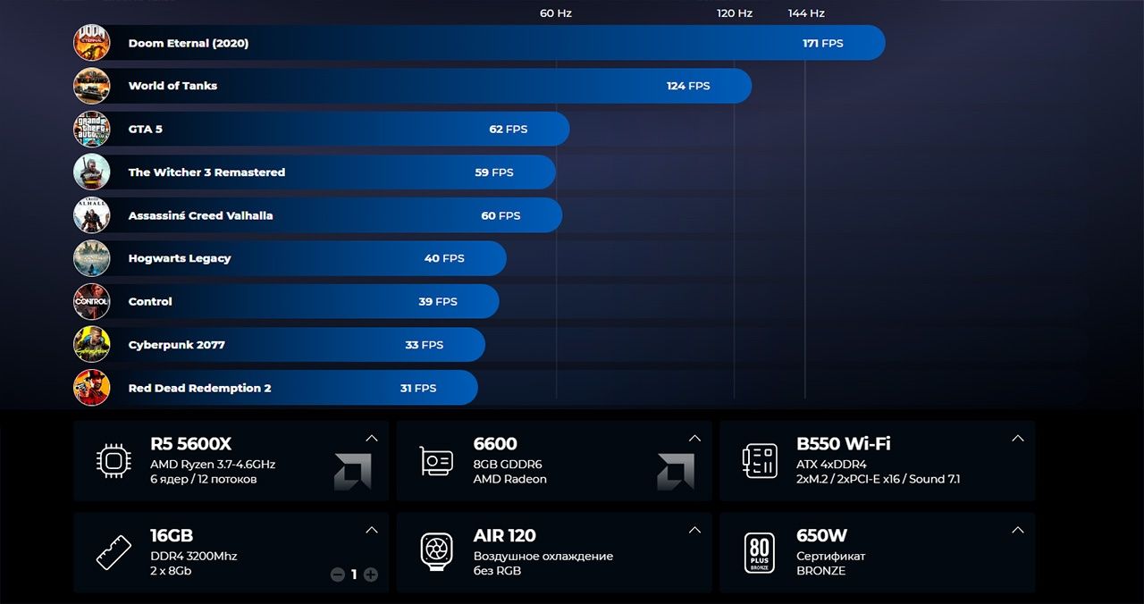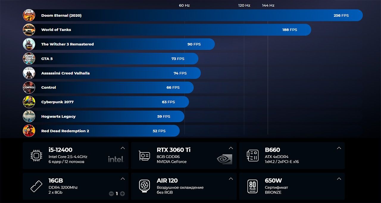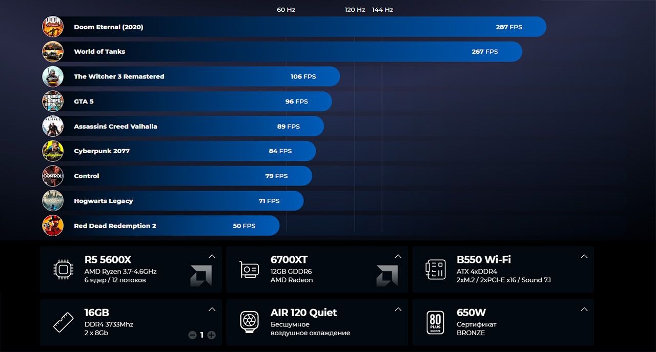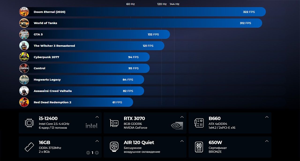 Наконец, конфигурация, которая без сомнений выдаст заметно больше 60 fps на самых высоких настройках во всех актуальных играх. С ней можно смело брать WQHD-монитор с частотой обновления 120 Гц и выше, да и задел на будущее останется. Здесь наиболее интересные предложения по части процессоров у Intel, видеокарту можно выбирать среди NVIDIA и AMD.