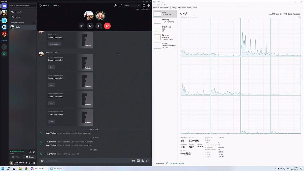 Здесь следует обратить внимание на распределение нагрузки между ядрами. Общая нагрузка на процессор от Discord довольно низкая. Но при этом всегда есть одно ядро, которое загружено более интенсивно. В среднем примерно на 11% с «прострелами» до 15%. Но всё же 6 ядер/12 потоков Ryzen 5 5600 наверняка обеспечат приемлемый fps в играх, запущенных параллельно с общением в Discord.