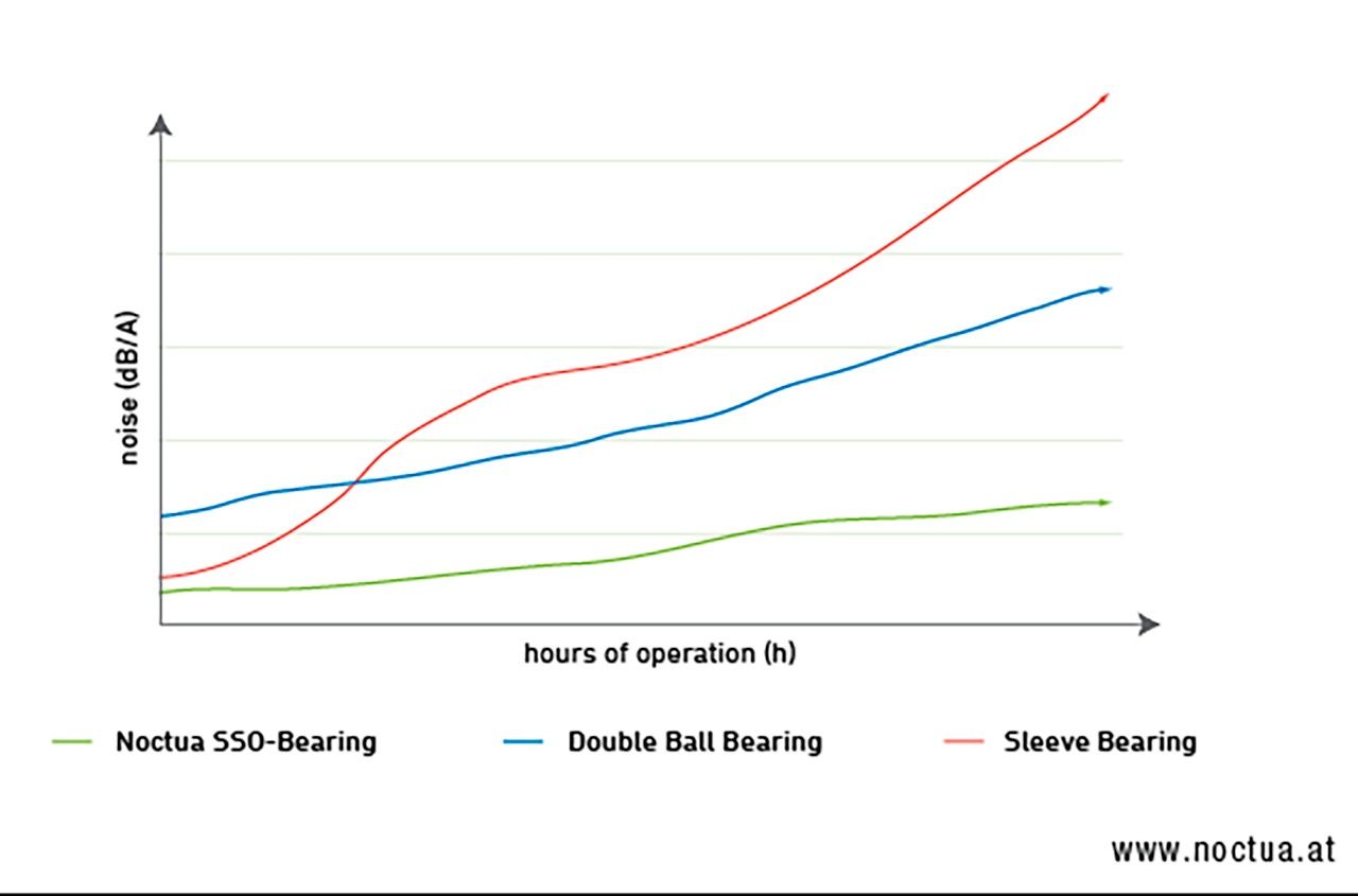Ощутимой разницы между дорогим и дешёвым вентилятором с аналогичными оборотами на немузыкальный слух просто нет… пока они новые. Дешёвый, базирующий на подшипнике скольжения или его модификациях, тихий пока новый. С годами, а то и месяцами, вал разбивает посадку, появляется биение, посадка разбивается сильнее, появляется гул от вибрации, позже ещё и скрежет. У дорогих вентиляторов шумовые характеристики неизменны на всём сроке службы.