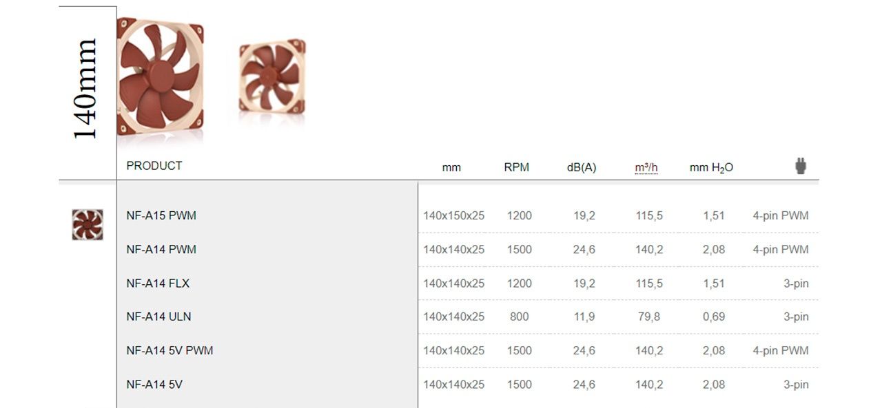 Как правило у 120-мм версий высокое статическое давление, то есть они дуют сильным потоком воздуха. Это отличный вариант для радиаторов с плотным стеком. 140 мм хотя и дают больше кубов, это рассеянный поток, что лучше в качестве корпусного охлаждения.
