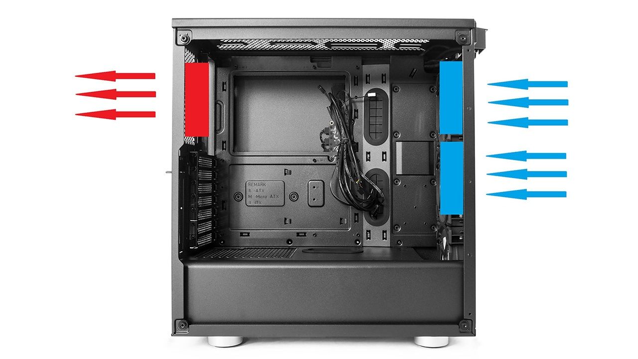 Кратко говоря, зачастую компьютер продувается спереди назад. Холодный воздух черпают и загоняют внутрь передние вентиляторы, горячий выбрасывает задний (частично верхние) – всё.
