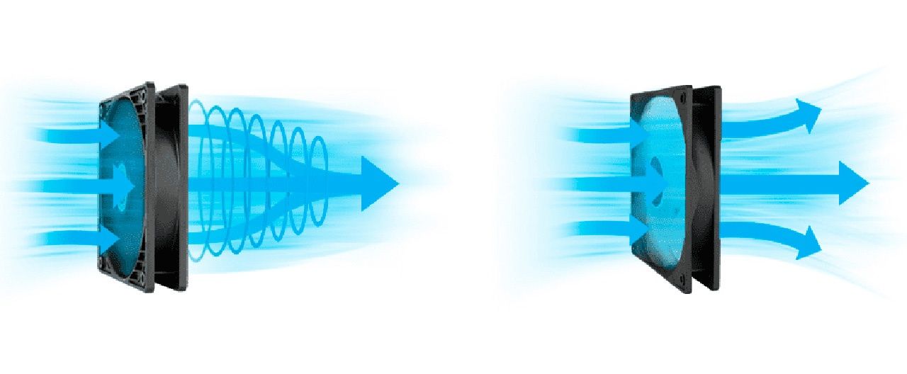 Тут же важно заметить, что есть 140-мм пропеллеры с высоким статическим давлением, и есть 120-мм с рассеянным потоком. Здесь куча нюансов, таких как угол атаки лопасти, её общая геометрия и наличие насечек на кончиках, количество лопастей, геометрия рамки и другие. Но в основном всё же 120 мм дуют плотнее, а 140 мм дуют больше.