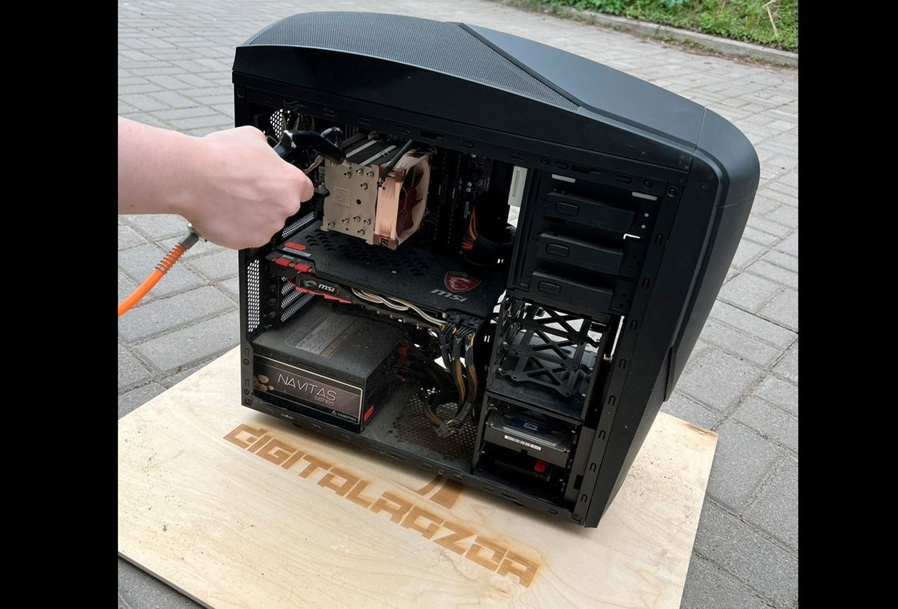 В запущенных случаях компьютер под мышку и на ближайшее СТО/автозаправку. За скромное вознаграждение в тех же 200 рублей сотрудники дадут воспользоваться компрессором. В очередной раз повторим, что с таким подходом поаккуратнее. Мощный поток воздуха вблизи гнёт радиаторы, раскручивает вентиляторы до неприемлемых скоростей, отрывает лопасти, отрывает компоненты платы. Другими словами, сдуру можно и орган сломать.