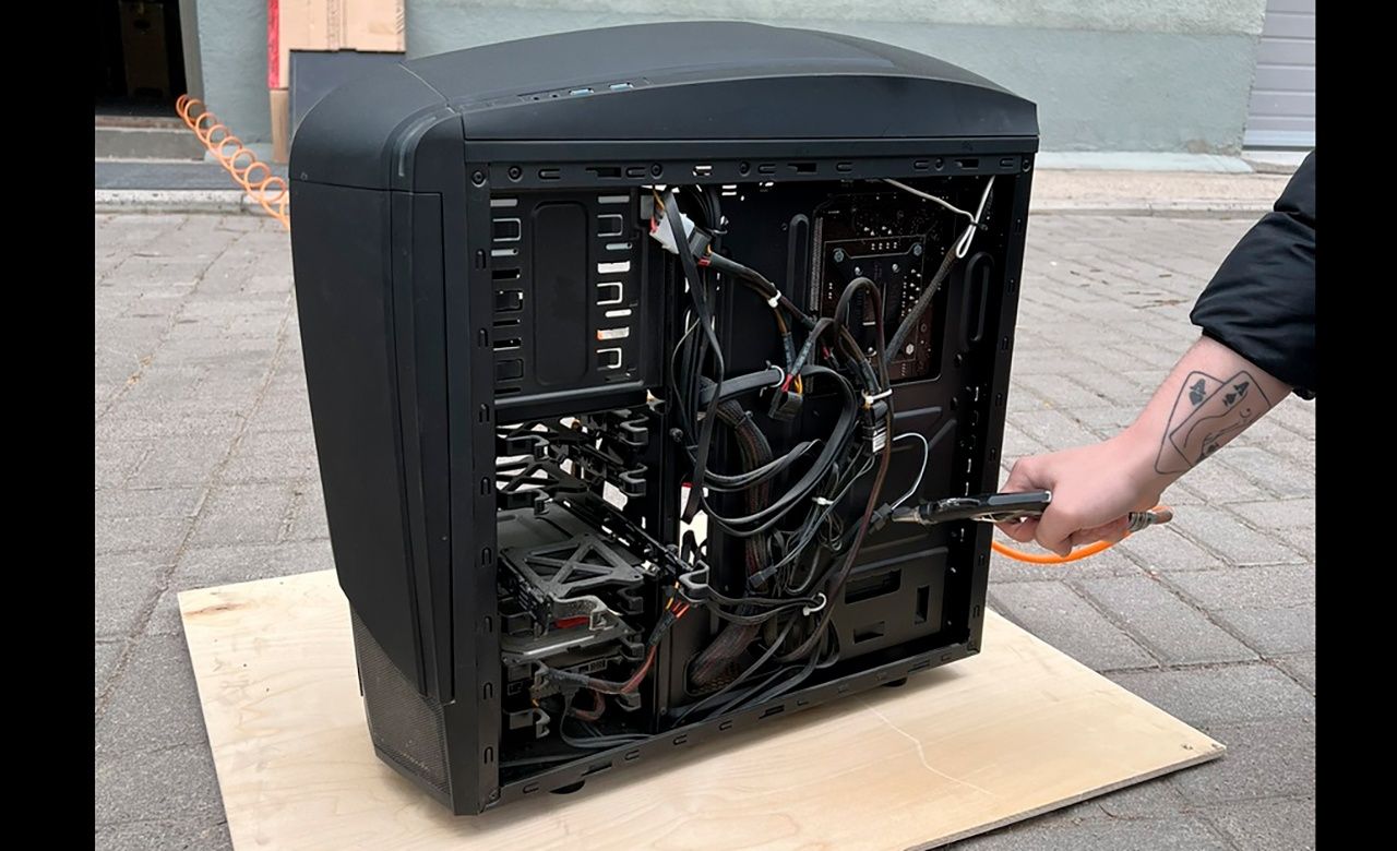Баллончик со сжатым воздухом на максималках. Великолепно выдувает всё. С компрессором, который выдаёт более 8 атмосфер, стоит быть аккуратным. Скорость потока больше скорости звука. Он настолько сильный, что может оторвать лопасти вентиляторов, или слишком сильно их раскрутить. Может оторвать и мелкие электронные компоненты с платы, вроде конденсаторов.