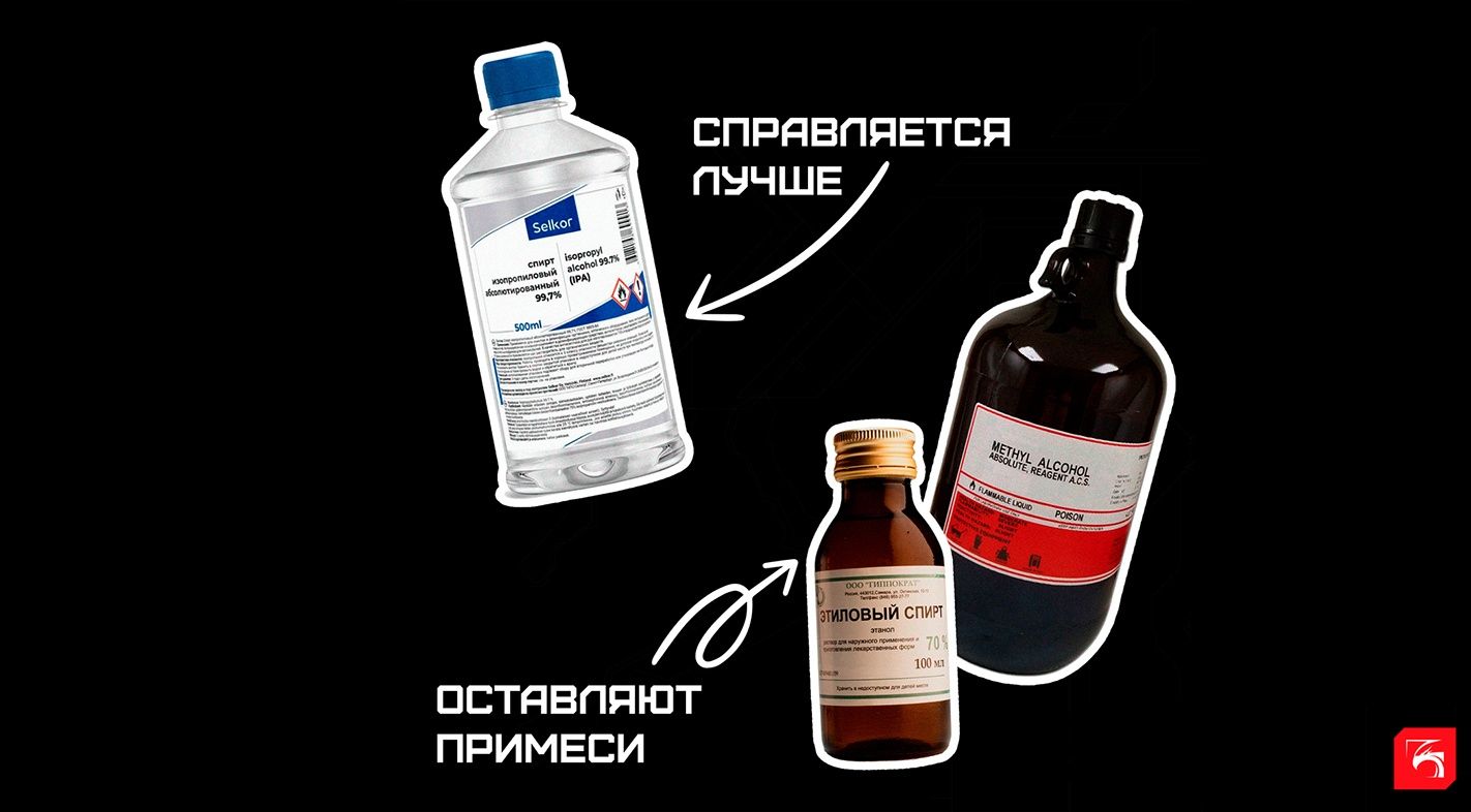 Различную автомобильную и домашнюю химию. Она может быть слишком агрессивна, может разъесть лак платы, попортить внешний вид. А может создать на поверхности токопроводящую плёнку (особенно актуально для составов «антипыль»). Только для внешних элементов корпуса и только когда точно уверены, что это такое. Для всего внутреннего спирт – гарантированно беспроблемный вариант.