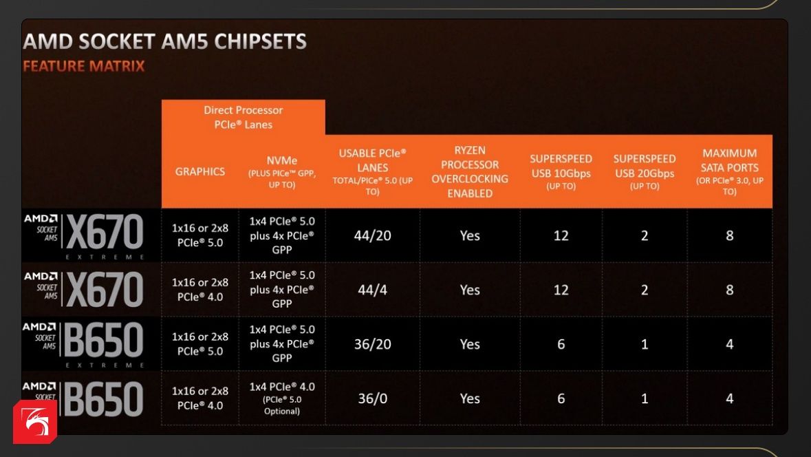 В случае с AMD: X670 и B650 — это буквально одна и та же микросхема. X670 — это фактически два совмещённых B650, то есть функциональные возможности просто удвоены. Для 99% пользователей излишне даже то, что предлагает обычный B650. Конечно, если вам не нужны 20 USB-портов и россыпь разъёмов для накопителей.