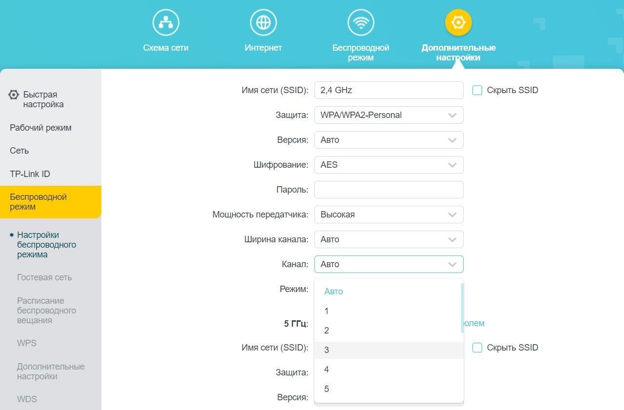 По умолчанию роутер использует самый популярный и загруженный диапазон - 2,4 ГГц. Но существует и диапазон 5 ГГц. Пока он менее распространён, поскольку только современные роутеры поддерживают обе частоты одновременно. Но учтите, что 5 ГГц имеют большую пропускную способность, но менее дальнобойны и хуже проходят стены. 2,4 ГГц - медленнее, зато дальше, и проникающая способность выше.