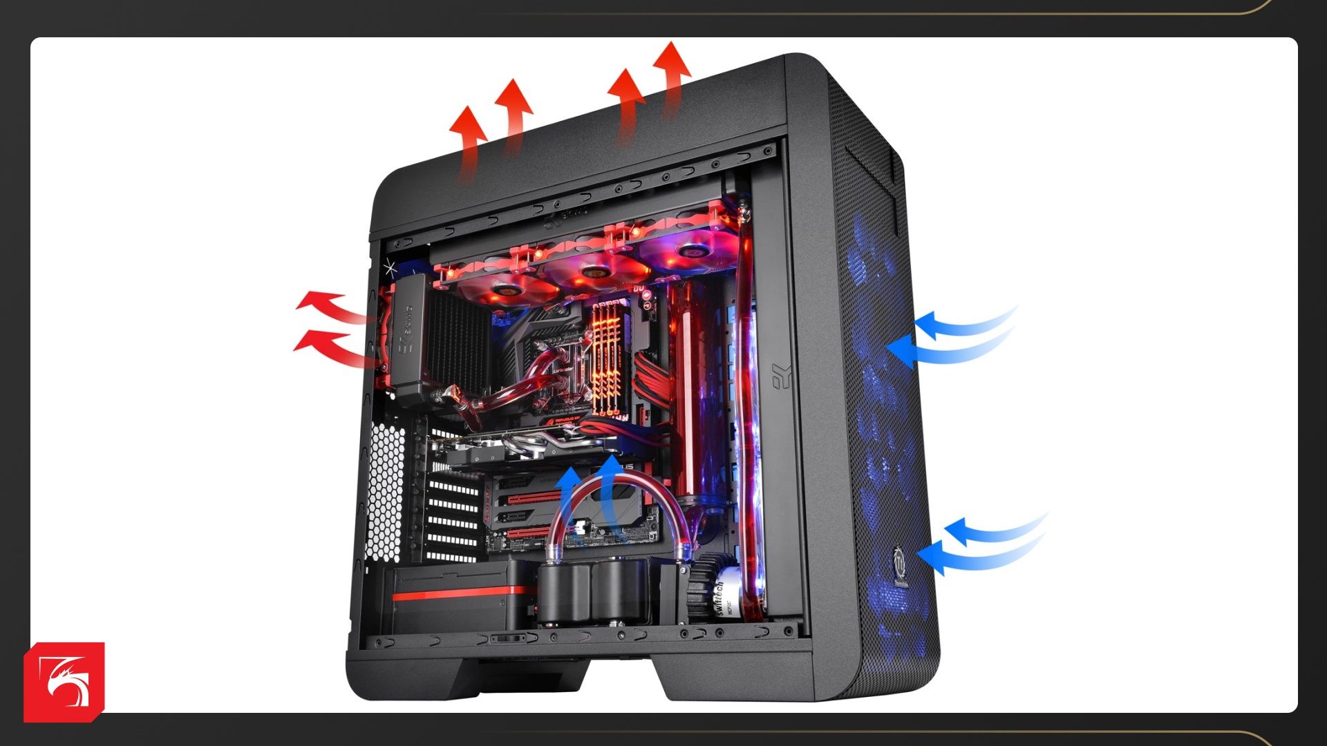 Для хорошей продуваемости необходимо наличие как минимум трёх корпусных вентиляторов: два на вдув спереди и один на выдув сзади. Если на переднюю панель устанавливается радиатор от системы жидкостного охлаждения для процессора, то корпусные вентиляторы устанавливаются только на выдув сзади и сверху.