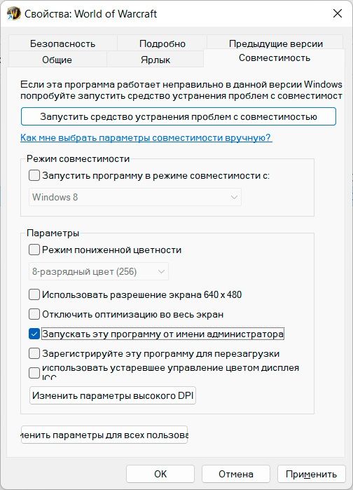 Перейдите во вкладку «совместимость» и поставьте галочку в поле «Запускать эту программу от имени администратора» и нажмите «ОК»;