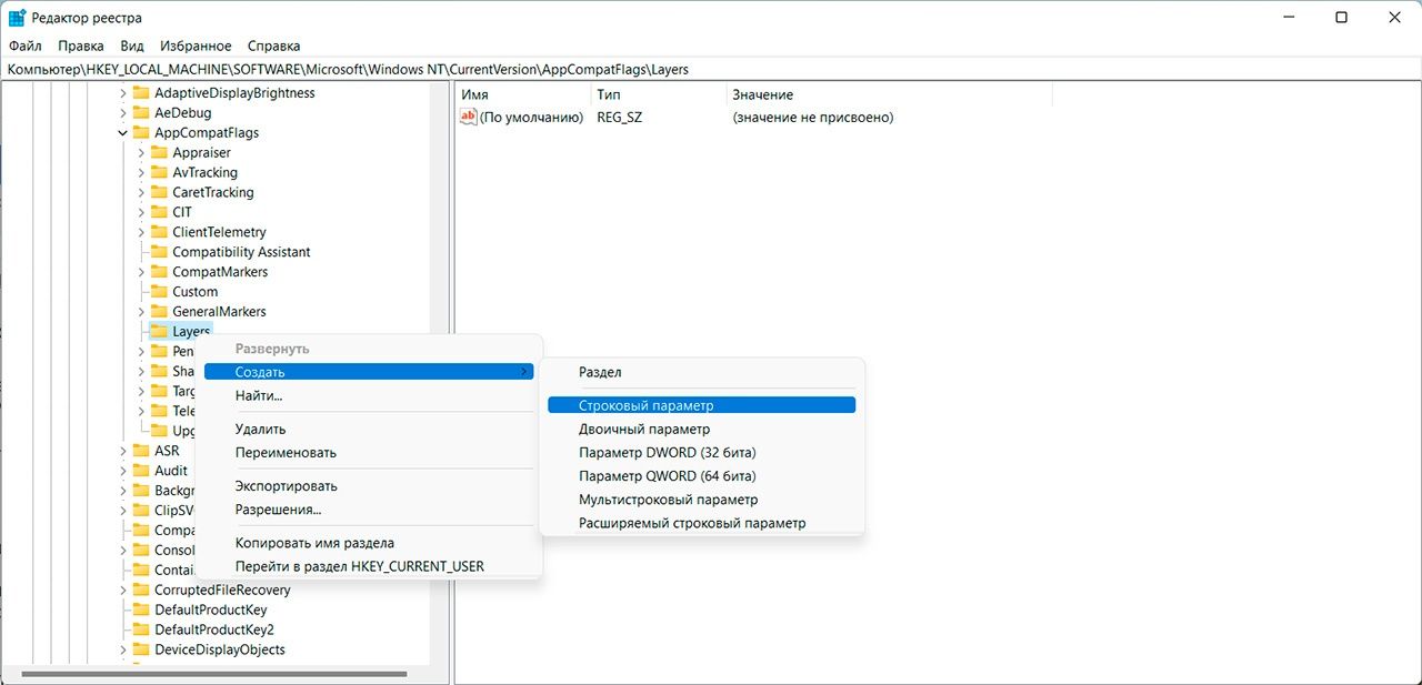 Перейдите по пути HKEY_LOCAL_MACHINE\ SOFTWARE\ Microsoft\ Windows NT\ CurrentVersion\ AppCompatFlags\ Layers;