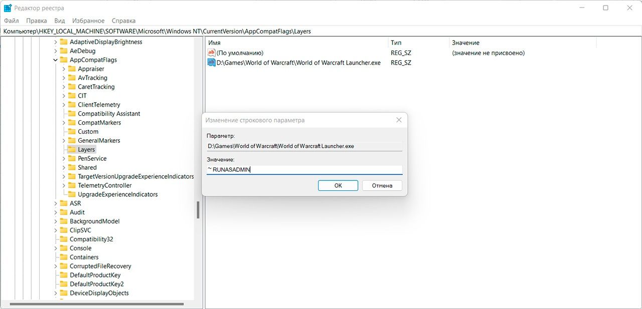 Откройте созданный параметр и в поле «Значение» введите ~ RUNASADMIN и нажмите «ОК»;