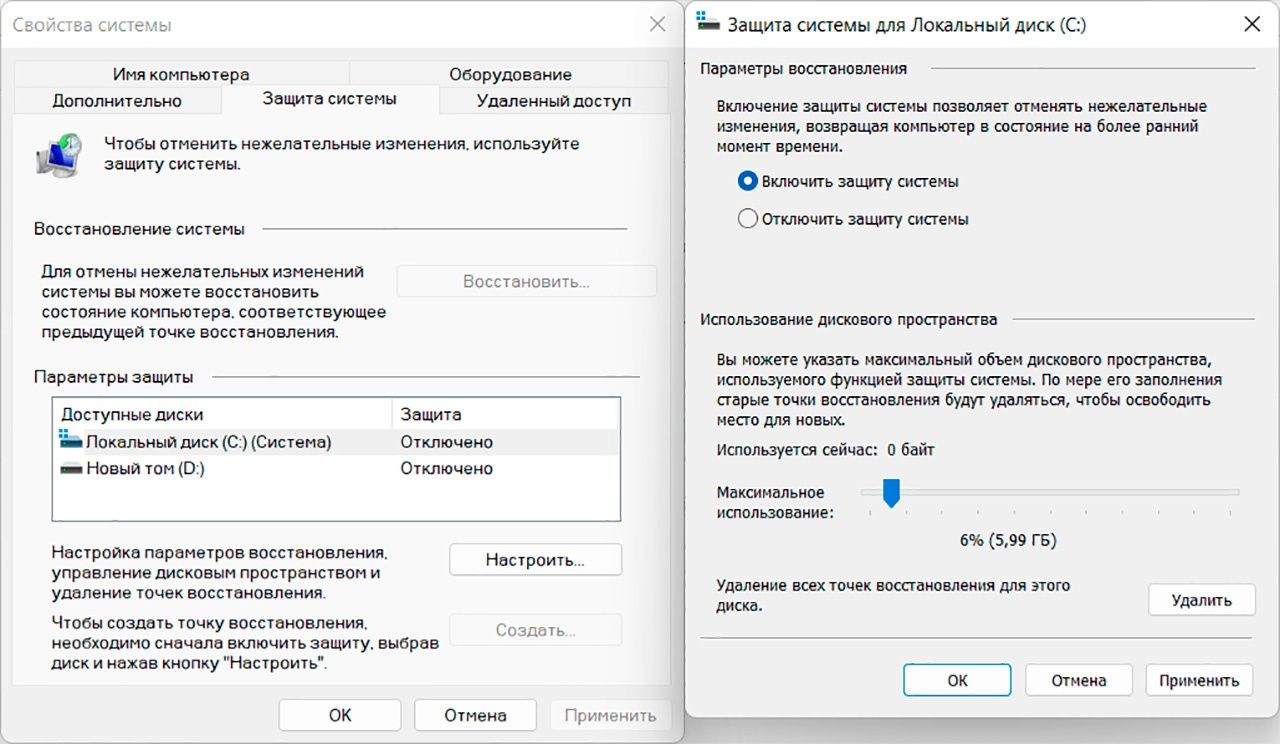 В открывшемся окне нажмите «Включить защиту системы», и выберите объем памяти, который пойдет под хранение точек.