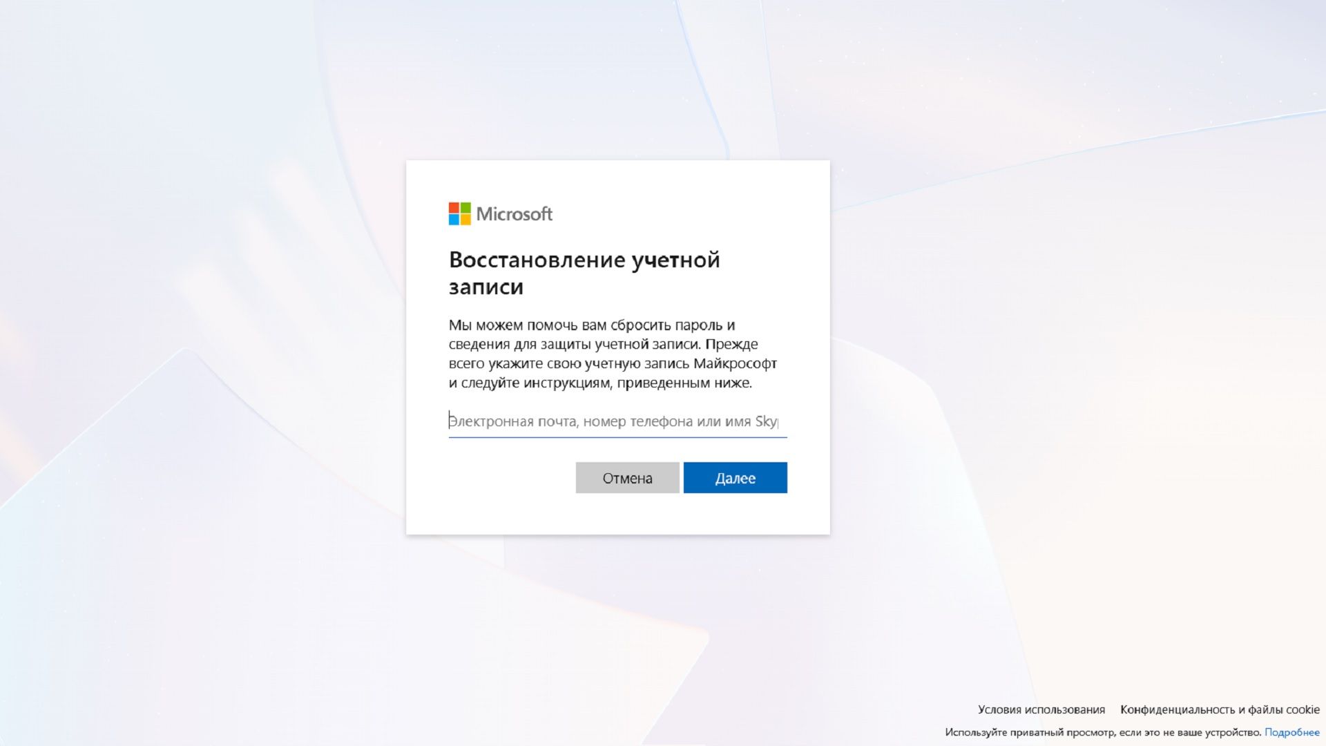 - Введите адрес электронной почты или номер телефона, связанный с учётной записью, и нажми «Далее».
