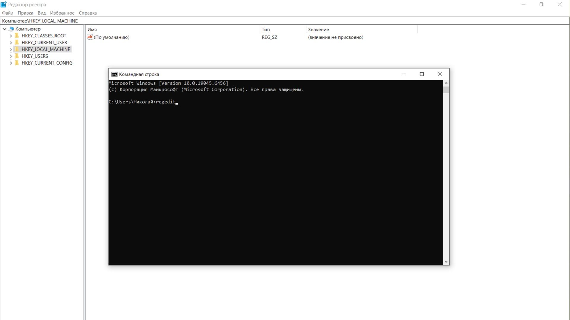 - Ещё важнее (Очистка): Не перезагружайся! Прямо в этой же командной строке снова введи regedit.