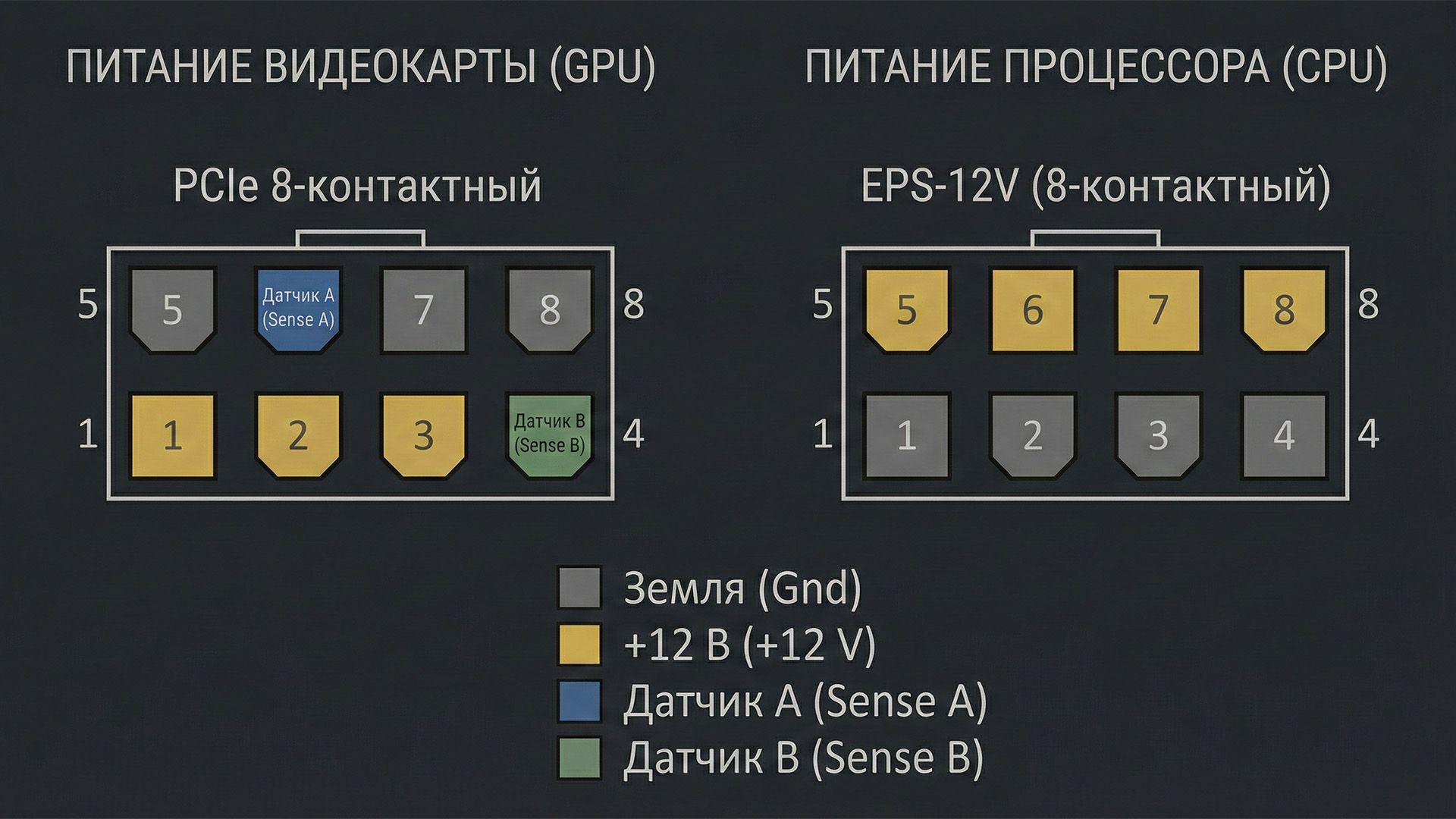 Распространённой ошибкой является попытка воткнуть 8-контактный коннектор PCI-Express в разъём процессора EPS12V. У них разная распиновка: контакты с напряжением +12В и землёй инвертированы. При силовом продавливании ключей происходит прямое короткое замыкание линии 12В, что активирует защиту в блоке питания и мгновенное отключение.