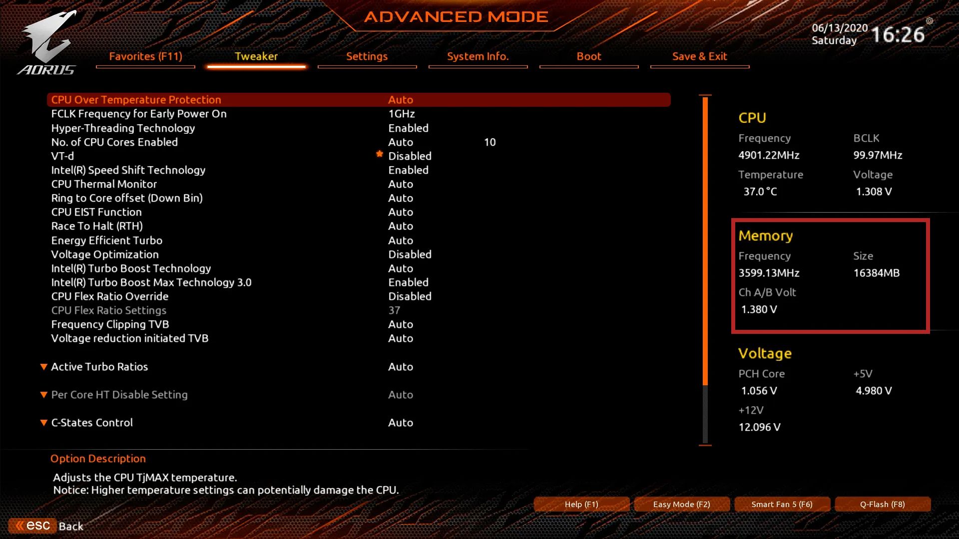 - В этом меню отображается текущая частота памяти. Если значение ниже заявленного, здесь же можно включить XMP или другой профиль разгона и заставить модули работать на полной скорости.
