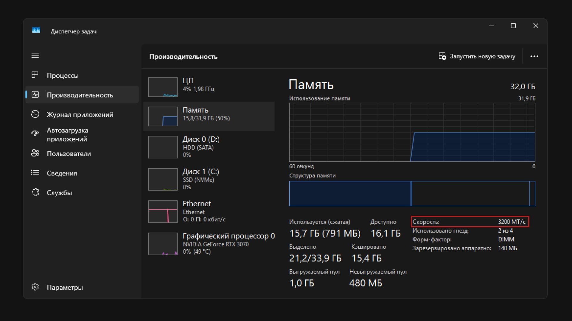 Проверка частоты (скорости) ОЗУ в диспетчере задач