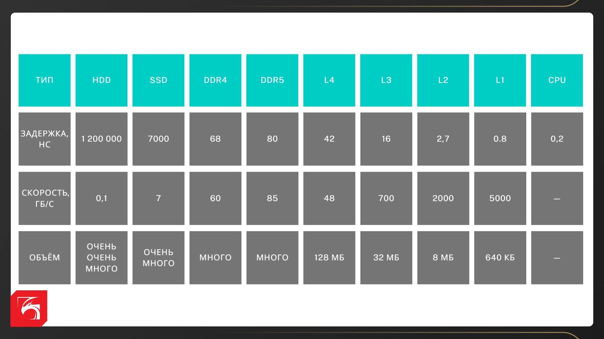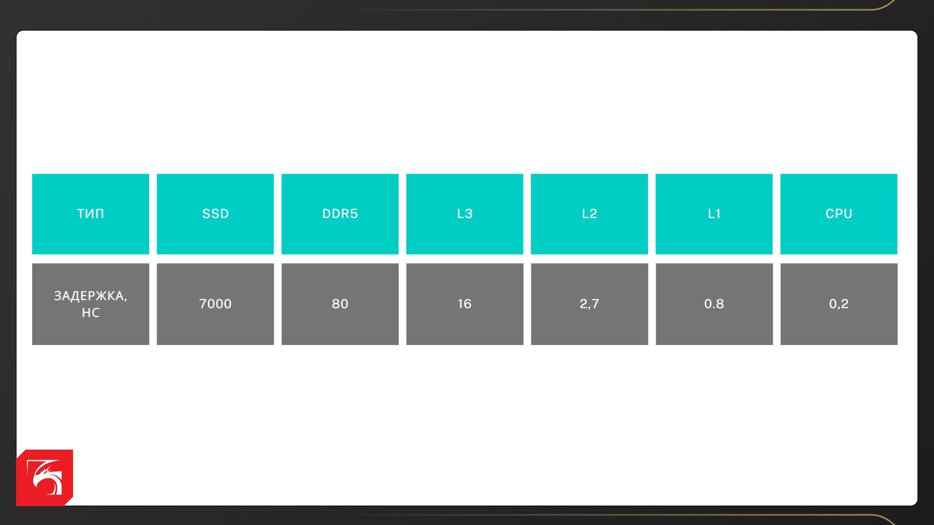 Представим абстрактный процессор с частотой работы 5 ГГц. Вне зависимости от архитектуры, поколения и производителя одно ядро выполнит операцию сложения двух чисел за один такт — 20 пикосекунд (1/5 наносекунды, или 0,0000000002 секунды). То есть в идеальных условиях система хранения должна выдавать данные за 20 пс. Но где же такую взять?
