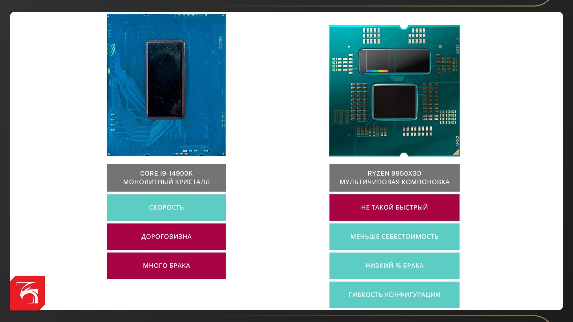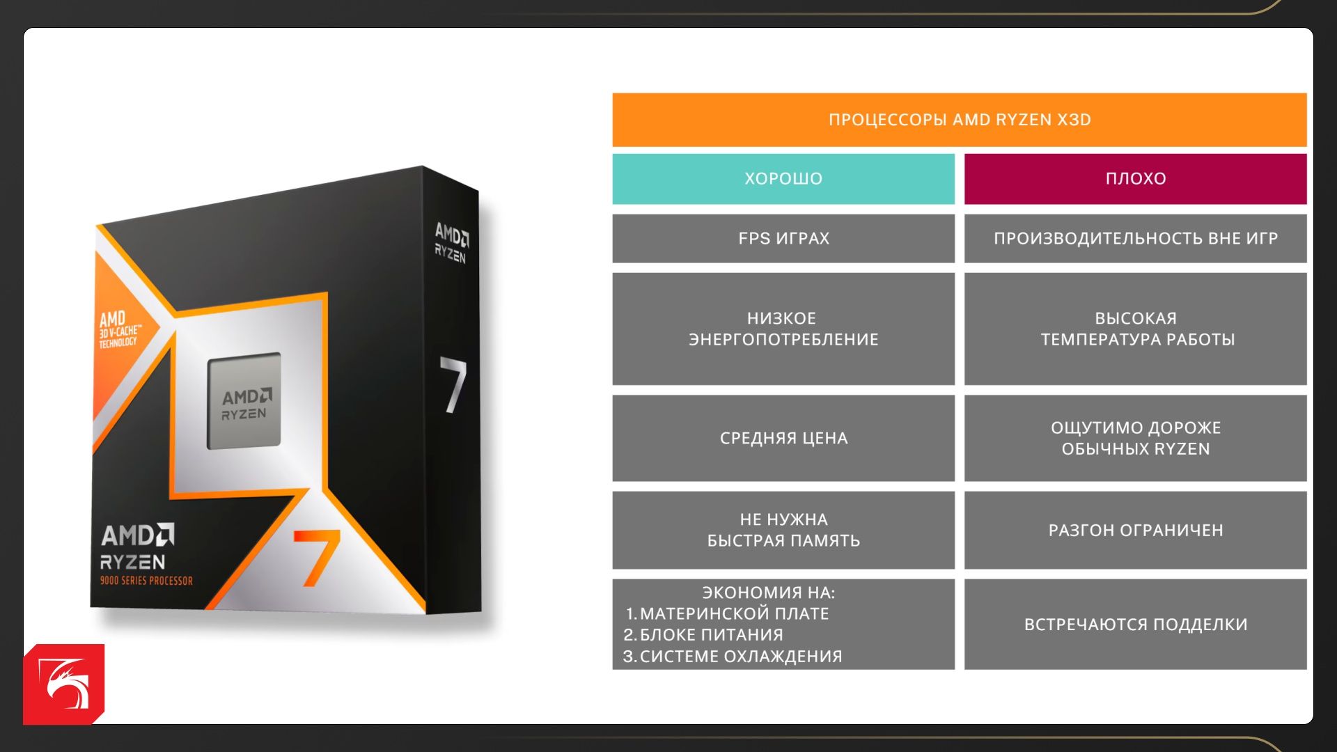 Семейство Ryzen X3D — самые популярные процессоры AMD в игровых компьютерах DigitalRazor.Речь идёт о сборке нескольких сотен X3D-компьютеров в год. С момента появления таких чипов ни один наш клиент не обратился в техподдержку с проблемами. Ни один. Зато сервис-центр сталкивался с подделками, про что расскажем чуть ниже, но не было ни единого выгорания.