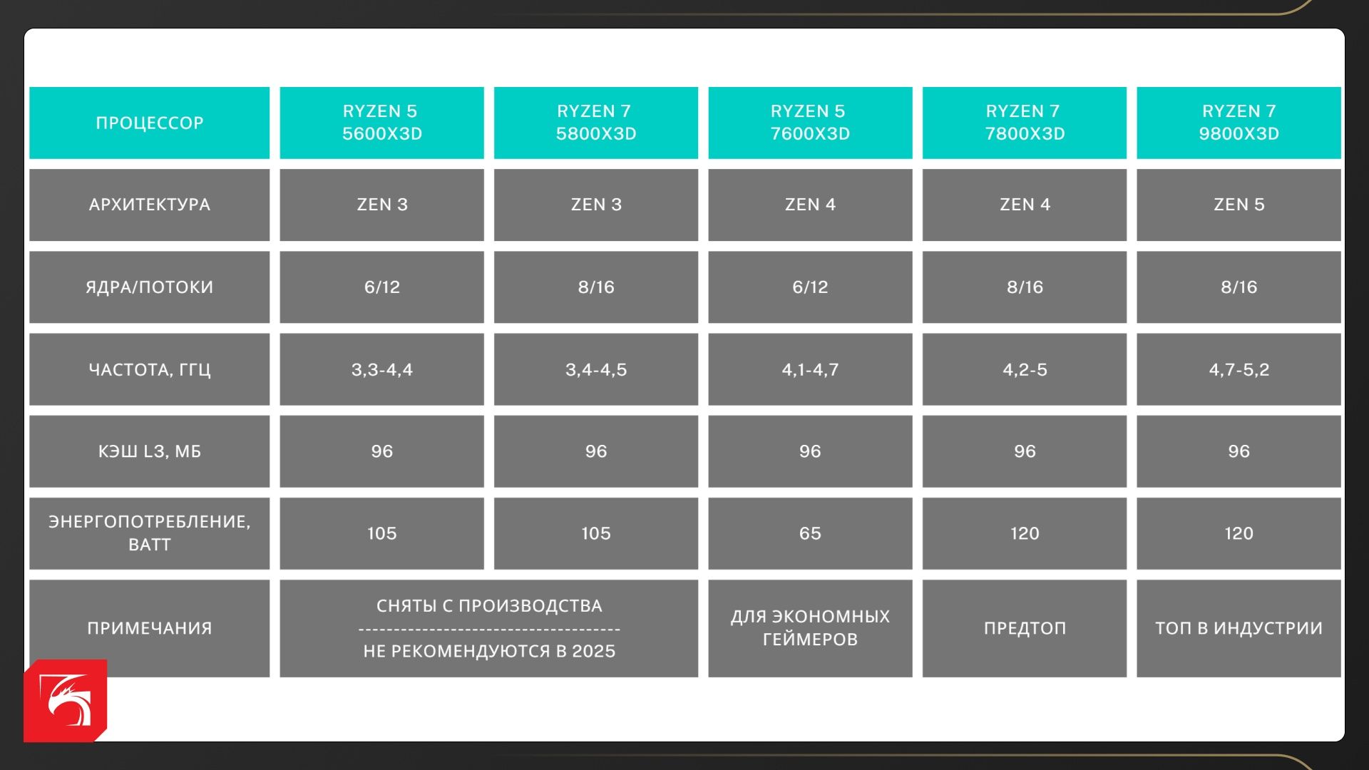 X3D-процессоры можно разбить на 2 семейства: для платформы AM4 (Ryzen 5000) и AM5 (Ryzen 7000 и 9000). В своё время представители платформы AM4 были очень интересным решением, но в 2025 году покупка нового ПК на AM4 — затея сомнительная.