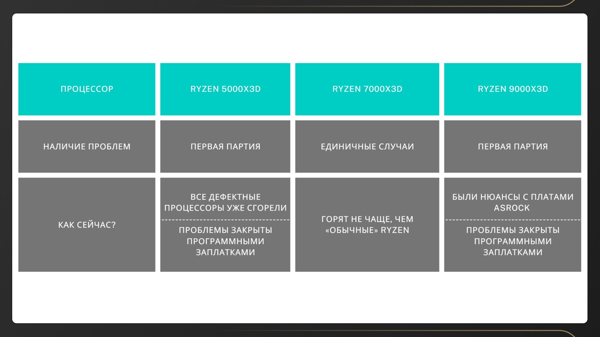 В Сети можно найти немало материалов на тему «Ryzen X3D выгорают». Об этом мы неоднократно рассказывали в нашем Telegram-канале со ссылками на сотни реальных случаев. Остановимся на проблеме более детально.
