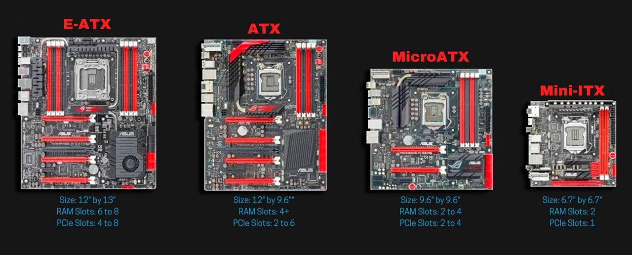 По сути, это размер материнской платы. От него зависит, какое техническое оснащение она будет нести: количество разъёмов под видеокарты, слоты для ОЗУ, для SSD и т.д. С другой стороны, чем больше материнская плата, тем больший понадобится корпус. Основные форм-факторы материнских плат: