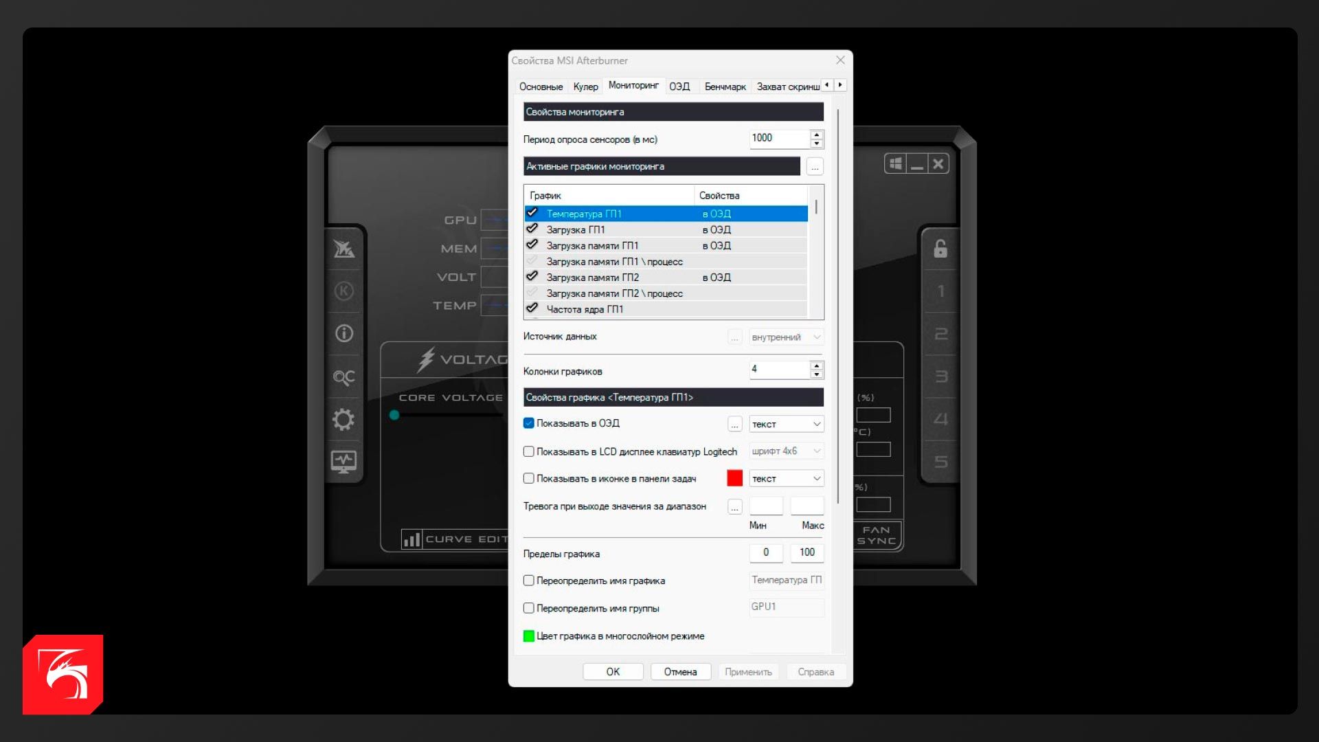 В окне со свойствами After Burner выбираем вкладку «ОЭД», которая находится правее «Активных графиков мониторинга». Там жмём кнопку «Дополнительно». После этого откроется RivaTuner.