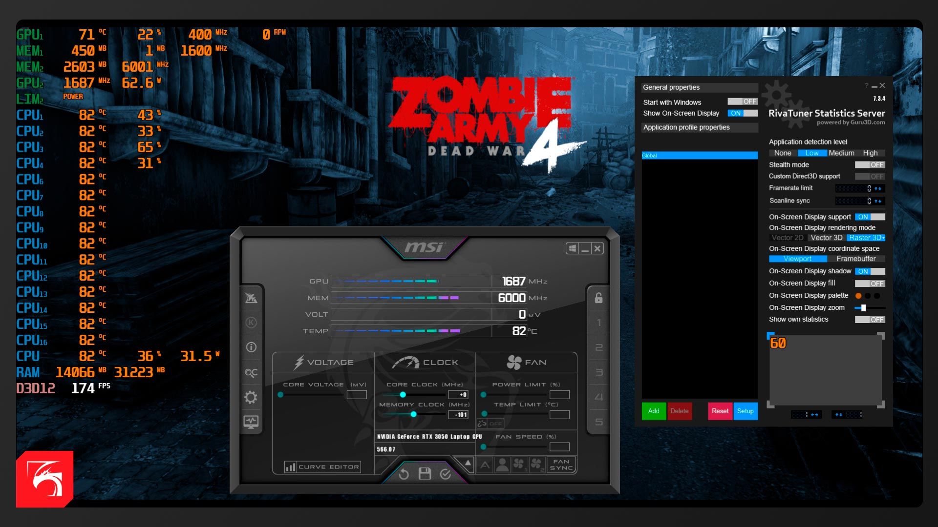 Со временем функциональность Afterburner расширилась, так что теперь программа способна многое рассказать про компьютер и его производительность. Можно узнать температуру процессора, видеокарты и оперативной памяти, вольтаж компонентов системы, FPS, загрузку RAM, температуру CPU и другие показатели. Интерфейс приложения, хоть и несколько футуристичен по-умолчанию, всё же понятен и показывает почти все нужные параметры.