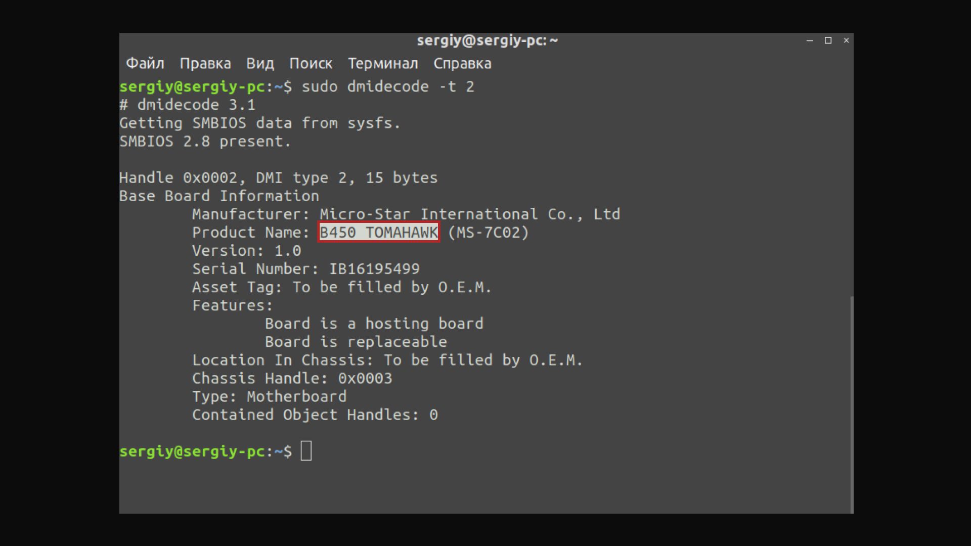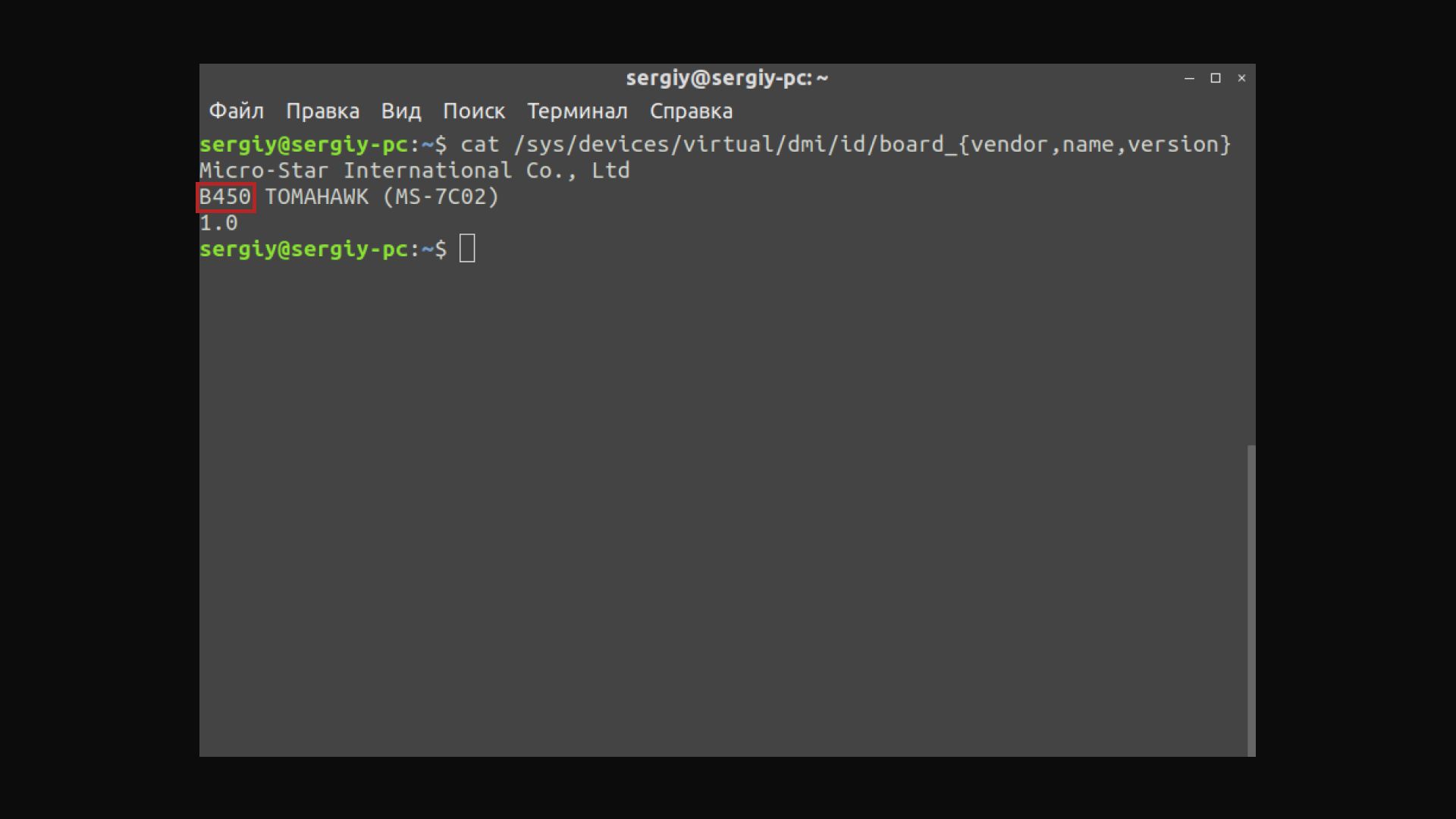 1. Открой терминал и выполни команду: cat /sys/devices/virtual/dmi/id/board_{vendor,name,version}
