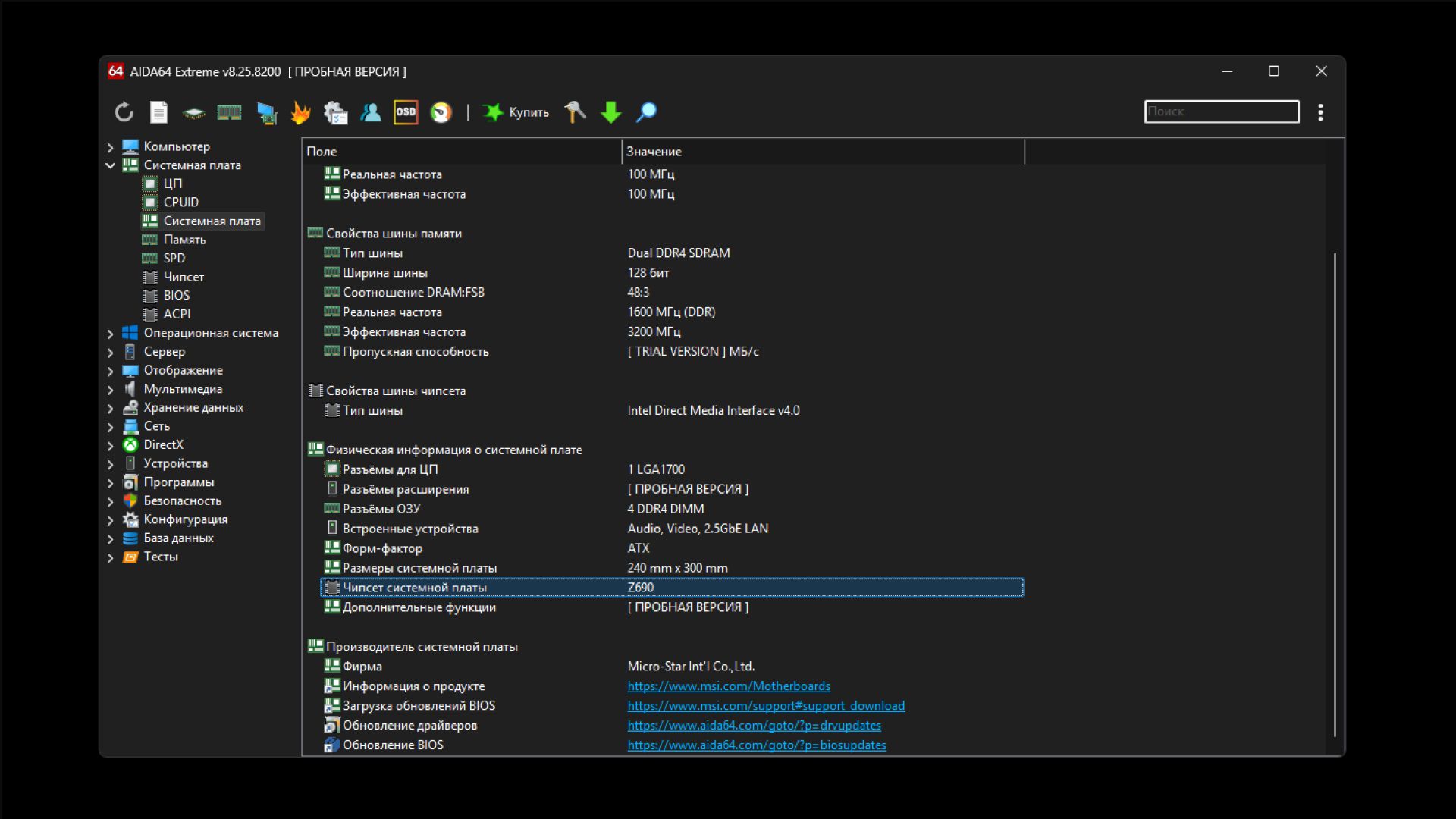 - В этом меню отображаются сведения системе, в том числе и чипсет.