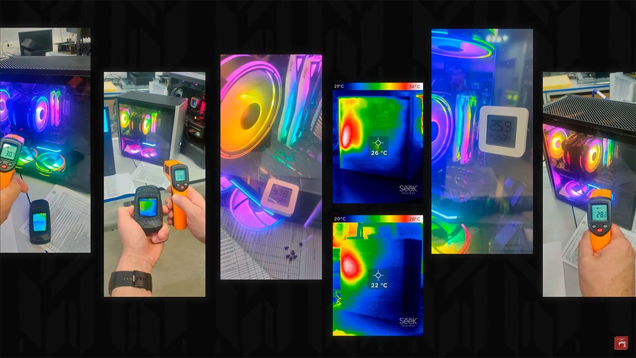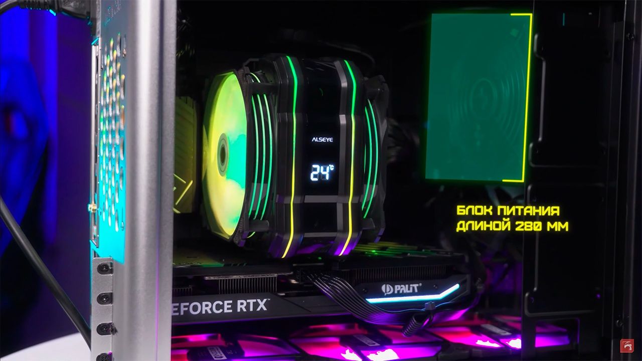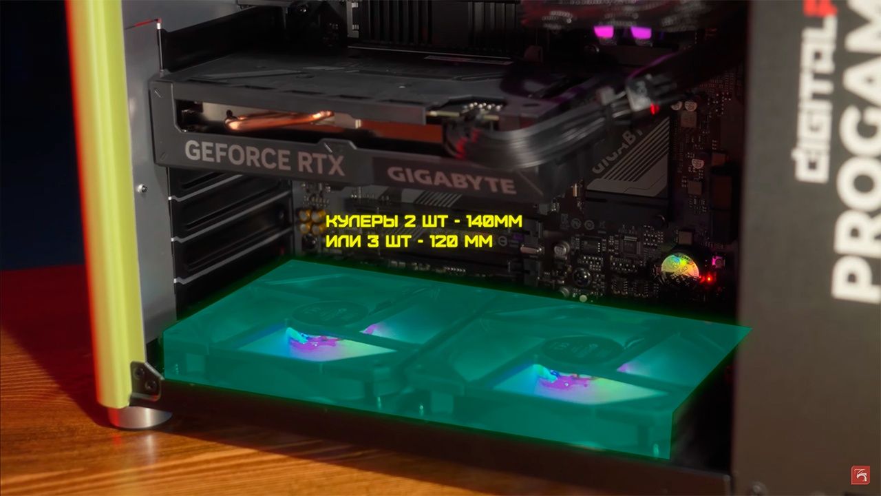С температурой проблем не будет. Корпус поддерживает установку 120 мм вентиляторов на заднюю часть, 3х 120 мм или 2х 140 мм снизу, и пару типоразмера до 140 мм сверху. Инфа для фанатов воды: есть опция установить систему водяного охлаждения с размером радиатора до 280 мм. Здесь можно отметить минус: за счёт такого расположения блока питания трехсекционная 360-мм вода не влезет, что создает ограничение по процессору. Наша рекомендация не использовать что-то старше i7-14700K. Core i9 с натяжкой. Для топовых AMD нормально.