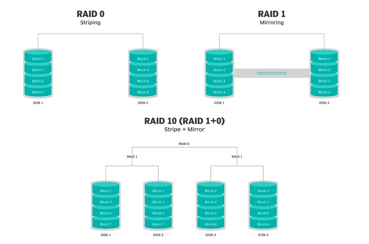 RAID – это технология объединения нескольких дисков. Существует множество уровней (считай вариаций) RAID-массивов. В потребительских системах хранения возможна реализация только 0, 1 и 10 уровней.