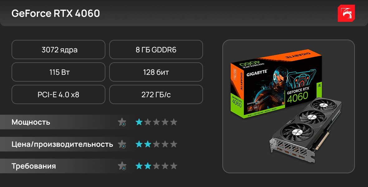 Несмотря на кастрированную память, за счёт мощного видеоядра RTX 4060 всё-таки лучше. Дополнительный плюс — самое низкое в подборке энергопотребление. Для старого ПК это отличный выбор.