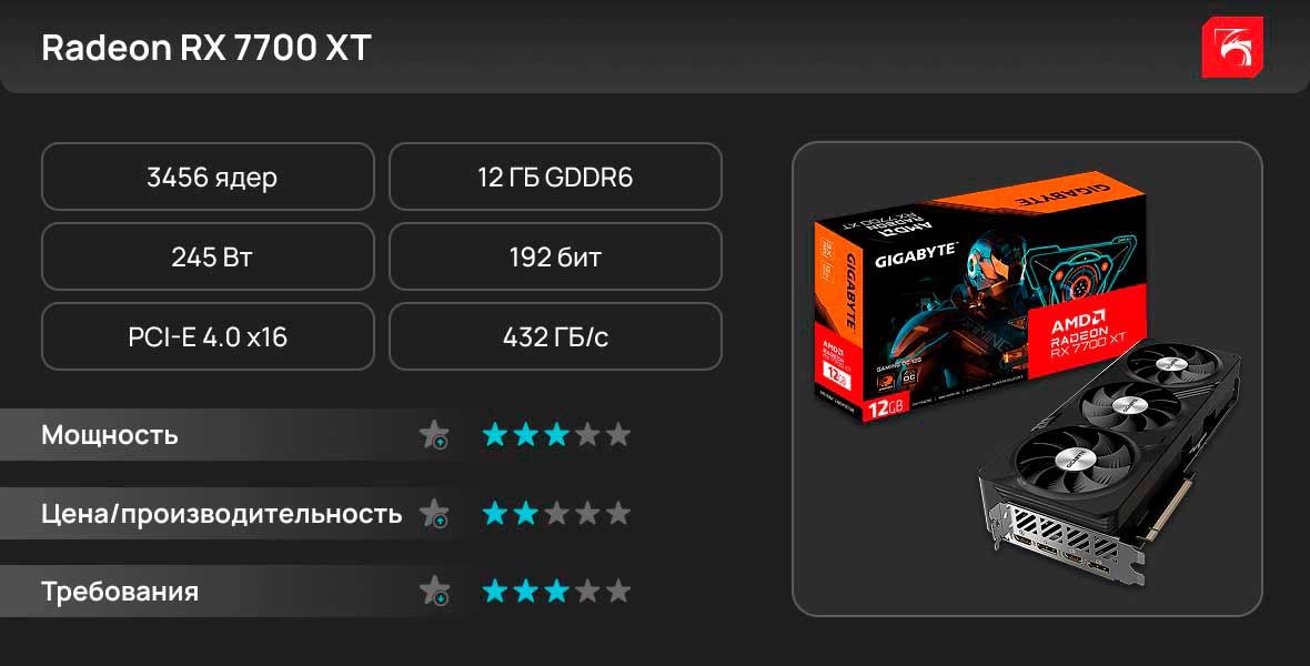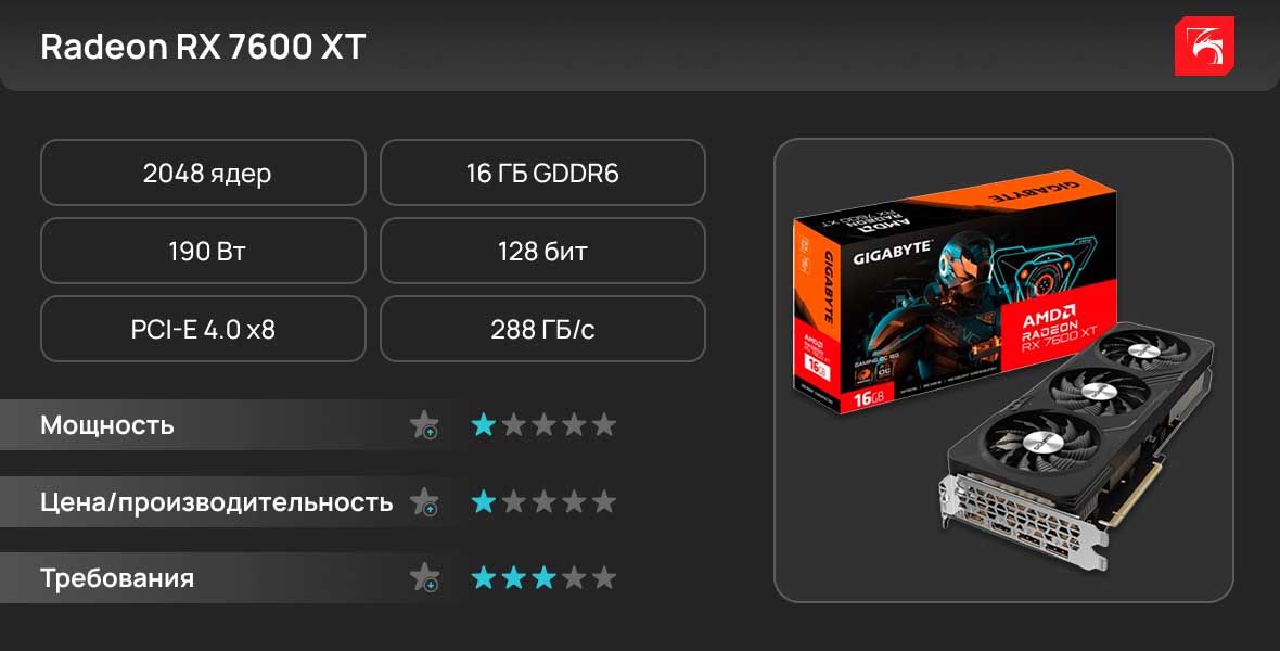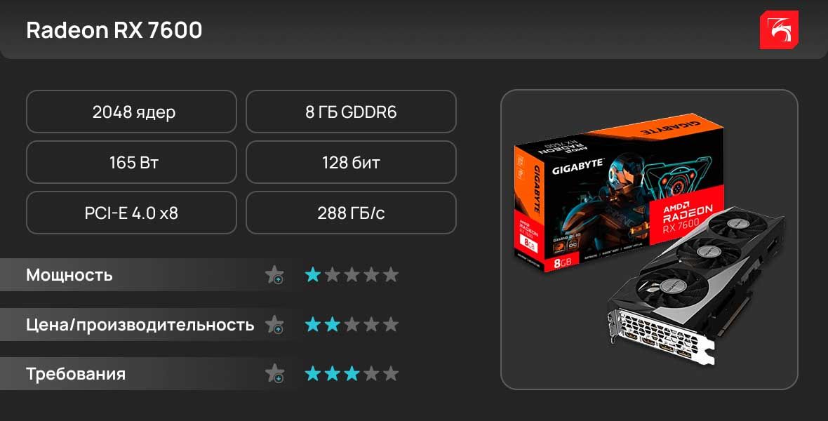 - В целом, хуже RX 7600, но сильно лучше с трассировкой;