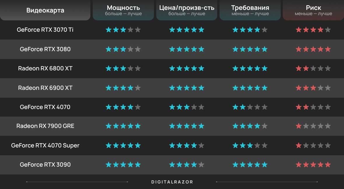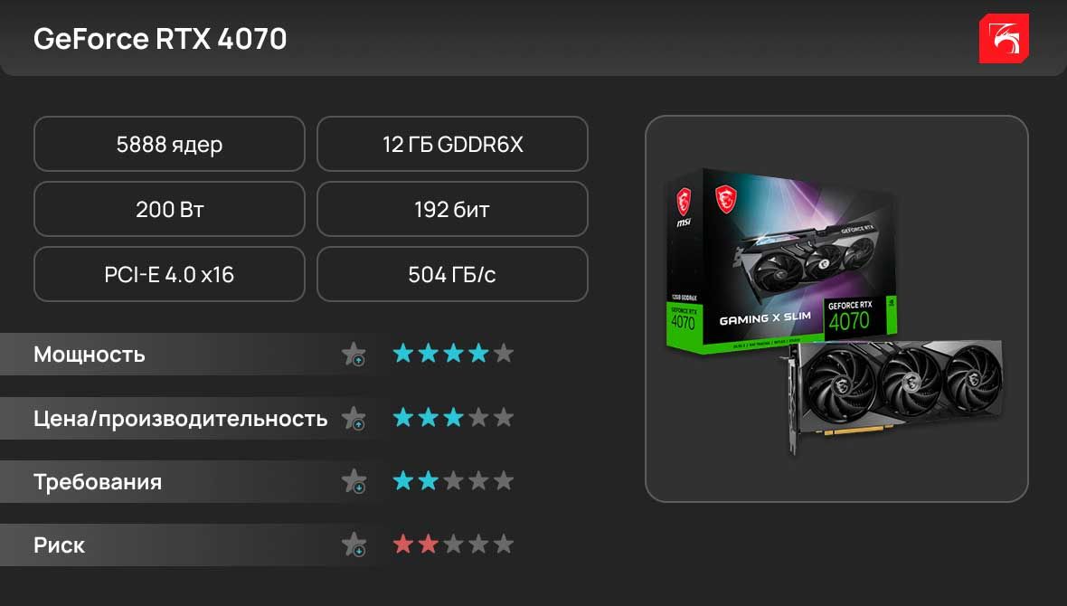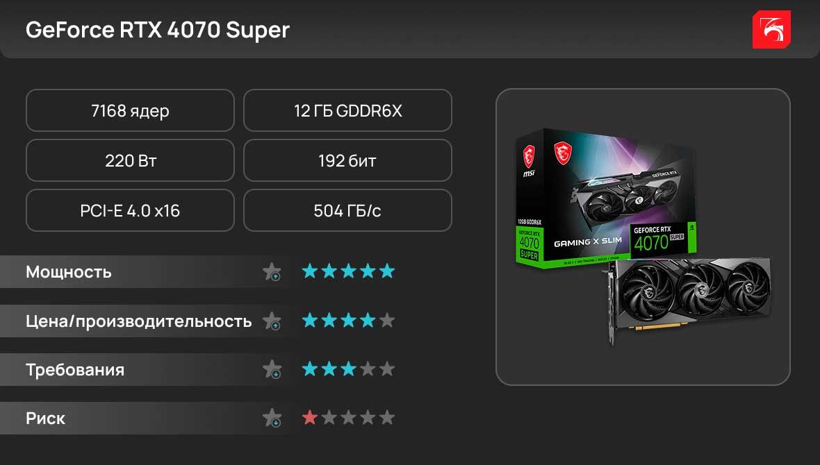 Улучшенная версия RTX 4070. Примечательна минимальным риском при покупке на вторичном рынке. Карту выпустили в январе 2024. Вентиляторы точно будут в хорошем состоянии. Замечательная и сбалансированная карта.
