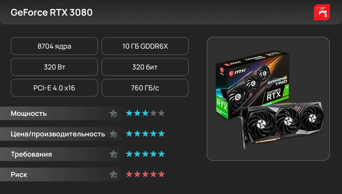 Старший брат RTX 3070 Ti. При незначительно большой цене предлагает сильно большие возможности. Больше видеопамяти, шире шина и ощутимо мощнее графический чип. Для понимания, если у RTX 3070 Ti всего 6144 CUDA-ядра, то 3080 предлагает аж 8704 CUDA — разница в ~42%!