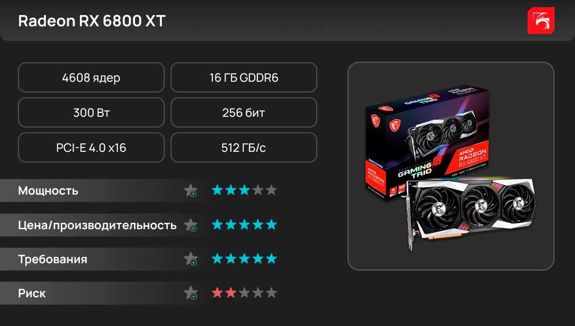 Обычно статус «легенда» видеокарта получает только спустя несколько лет — когда становится понятно, что получилась реально удачная модель. Radeon RX 6800 XT умудрилась стать легендой сразу в момент выхода за счёт великолепного соотношения цена/производительность. Благодаря 16 ГБ видеопамяти карта хорошо состарилась.