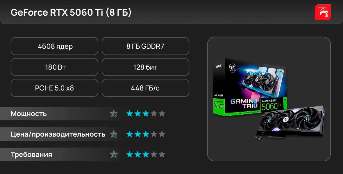 - Чуть быстрее RTX 5060 Ti 16 ГБ;
