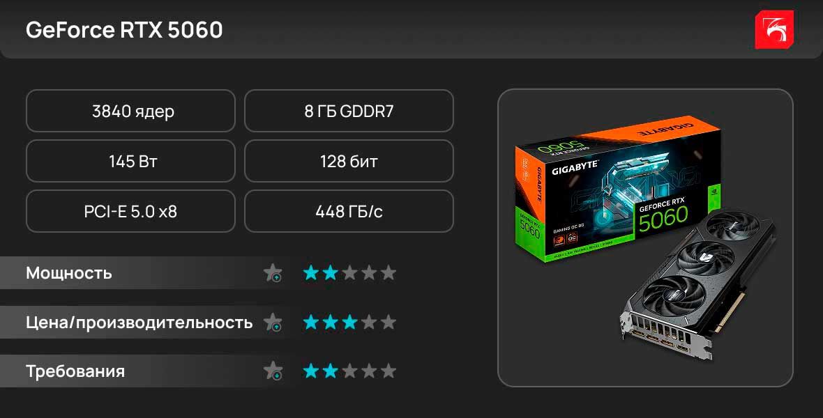 Лучшее предложение в бюджете около 30к рублей. Чисто технически это RTX 5050 на максималках. Немного дороже, немного больше «аппетиты», но оно того стоит. Ничем особо не выделяется, просто сбалансированное предложение. Это почти самая популярная карта в наших недорогих игровых ПК.