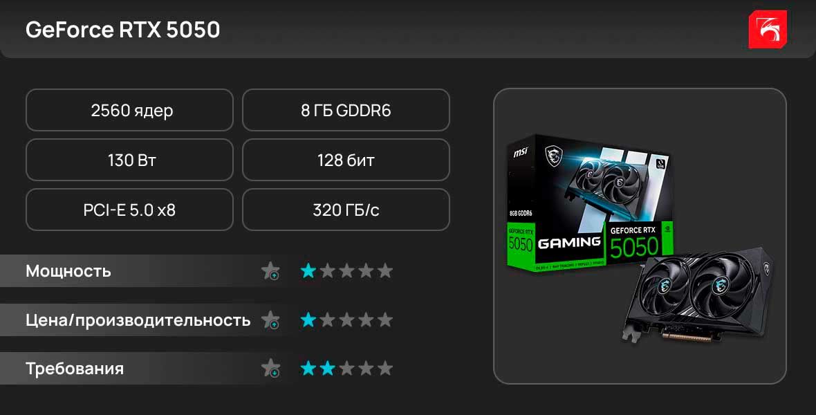 RTX 5050 — видеокарта, которую нельзя покупать. За такие деньги она просто бестолковая. В качестве мультимедийной «затычки» для YouTube и твоих любимых «Героев 3» она слишком дорогая, да требует не самого хилого блока питания. Разумнее докинуть чуть-чуть и взять RTX 5060.