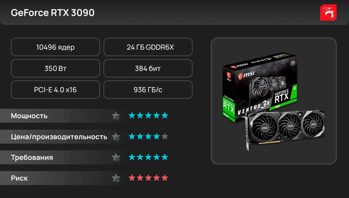 RTX 5090 из 2020-го. Начиная с этой видеокарты у NVIDIA появились суперфлагманы с баснословной ценой (старые Titan не в счёт). Самая мощная, но самая рискованная видеокарта в подборке. Чрезвычайно прожорливая, зато 24 ГБ видеопамяти. Среди всех моделей с памятью GDDR6X именно RTX 3090 горели чаще всего. Причина — много чипов, плохое охлаждение, общая теплонагруженность. 110 градусов на памяти — обычное дело. Не нужна тебе такая видеокарта, брат.