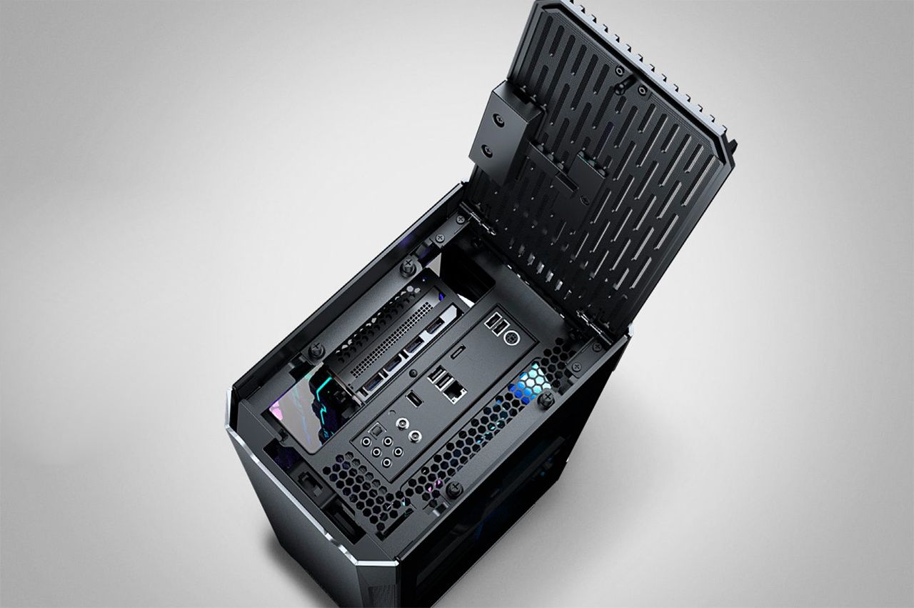 Несильным нажатием верхняя панель открывается как шкатулка и даёт доступ к портам ввода-вывода материнской платы и разъёмам видеокарты. Ввод к блоку питания подключается не здесь. Соответствующий разъём выведен внизу-сзади.