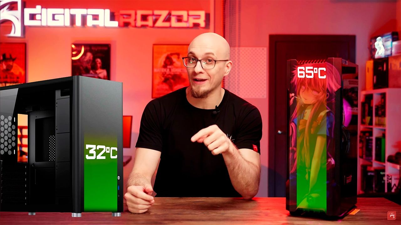 Даже в конфигурации Core i5 + RTX 4070 Super боковое стекло разогревается до 65 градусов, до него едва можно дотронуться. Это в два раза больше, чем у Jonsbo D40, который мы недавно рассматривали.