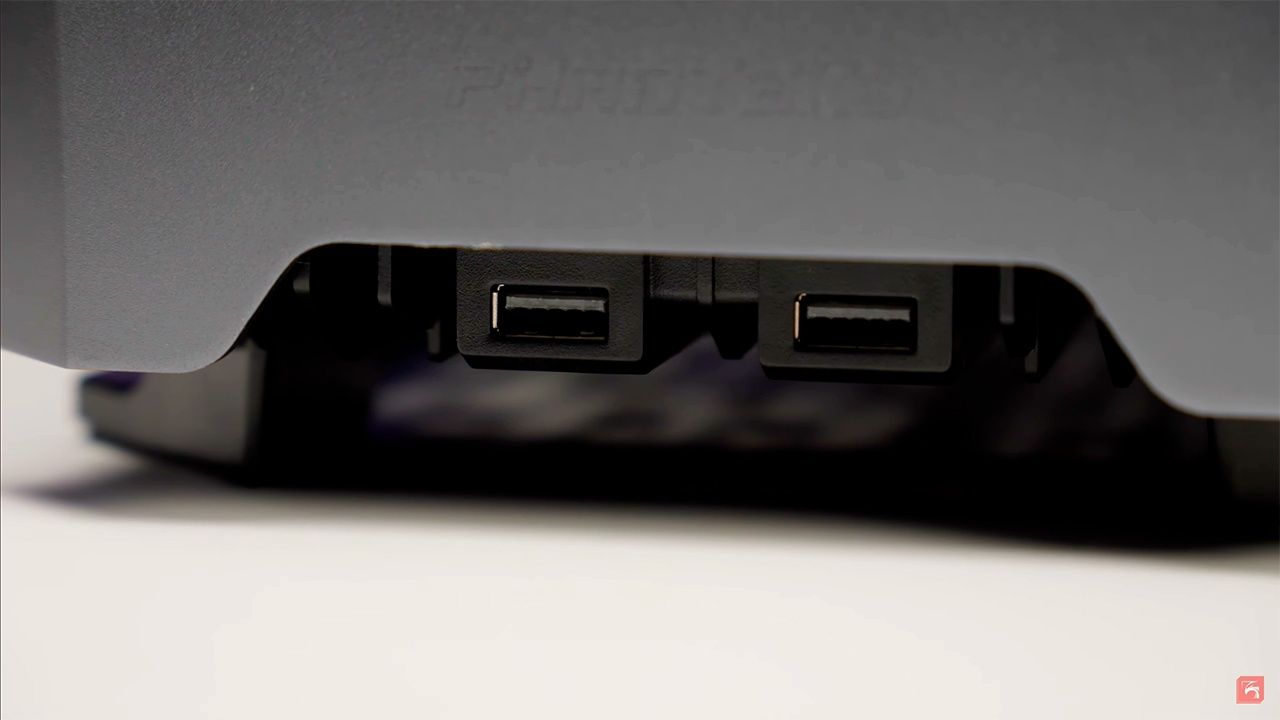 На фронтальной стороне внизу спрятались 2 неочевидных USB-порта. Хоть они и серые, на самом деле это USB 3.0. Такое расположение неплохое, если компьютер стоит на столе, но если внизу или где-нибудь в нише уже не очень удобно. Впрочем, прятать такую красоту под стол неэтично, да и 490 мм высоты не позволят разгуляться.